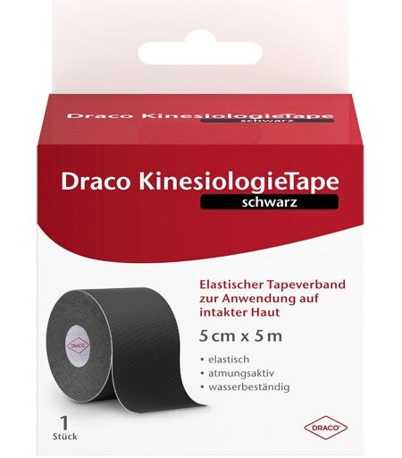 Draco KinesiologieTape schwarz elastischer Tapeverband für den Einsatz in der Kinesiologie Draco KinesiologieTape ist ein elastisches, atmungsaktives und wasserbeständiges Rollenpflaster für vielseitige Einsatzgebiete in der Kinesiologie. Das Draco KinesiologieTape kann in der Sportmedizin zum Schutz und zur Stabilisierung der Gelenk- und Muskelfunktionen beim sportlicher Belastung und im Rahmen der orthopädischen Behandlung eingesetzt werden. Das kinesiologische Tape schränkt dabei die Bewegungsfreiheit nicht ein. Draco KinesiologieTape ist längs- sowie schrägelastisch und wasserbeständig. Hautfreundlicher Kleber sorgt für gute Verträglichkeit auch bei langer Tragedauer. Tragedauer: mehrere Tage Material: 90 % Baumwolle, 10 % elastische Urethanfaser Kleber: Acrylat-Haftkleber ...