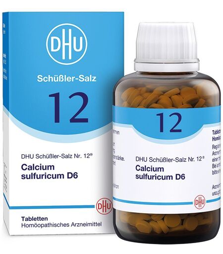 DHU Schüßler-Salz Nr. 12 ist ein homöopathisches Arzneimittel. Die Anwendung erfolgt ausschließlich aufgrund der langjährigen Verwendung in dieser Therapie. DHU Schüßler-Salz Nr. 12® Calcium sulfuricum D3 [D6, D12] Anwendungsgebiete: Registriertes homöopathisches Arzneimittel, daher ohne Angabe einer therapeutischen Indikation. Zu Risiken und Nebenwirkungen lesen Sie die Packungsbeilage und fragen Sie Ihren Arzt oder Apotheker. Enthält Lactose und Weizenstärke. Packungsbeilage beachten! Deutsche Homöopathie-Union DHU-Arzneimittel GmbH & Co. KG, Karlsruhe ...