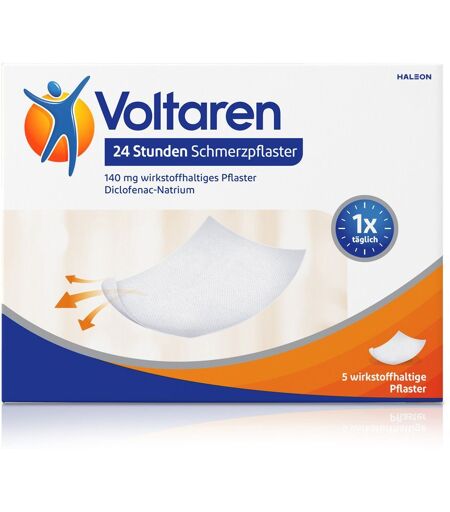 Effektive Schmerzlinderung* * nach 4-tägiger Anwendung 24 Stunden Wirkstofffreisetzung Diclofenac; entzündungshemmend; dringt tief bis zur schmerzenden Stelle vor Behandlung mit Wirkstoff statt Wärme 10 x 14 cm selbstklebendes Pflaster auf die schmerzende Stelle kleben Auf die trockene und nicht eingecremte Haut der schmerzenden Stelle kleben WIE PROFITIEREN SIE? Sie suchen nach spürbarer Schmerzlinderung für mehr Freude an der Bewegung? Der Wirkstoff Diclofenac im Voltaren 24 Stunden Schmerzpflaster lindert wirksam/effektiv akute Muskelschmerzen. Das Schmerzpflaster setzt statt Wärme den Wirkstoff Diclofenac frei. Im Gegensatz zu Wärmepflastern, enthält das Voltaren 24 Stunden Schmerzpflaster einen entzündungshemmenden Wirkstoff. Zur lokalen Schmerzbekämpfung dringt der entzündungshemmende Wirkstoff nach und nach in die Haut ein. Während der Anwendungsdauer von 24 Stunden bekämpft der Wirkstoff den Schmerz, wo er entsteht. Was Sie auch vorhaben – Voltaren unterstützt Sie dabei. WIE WIRD ES ANGEWENDET? Kleben Sie einmal täglich ein wirkstoffhaltiges Pflaster auf die schmerzende Stelle. Ziehen Sie zunächst eine Schutzfolie ab und bringen Sie das Pflaster dann auf die gesunde und intakte Haut über der schmerzenden Stelle an. Für optimale Klebefähigkeit das Pflaster auf trockener, nicht eingecremter Haut für einige Zeit (z.B. 30 Sekunden) leicht andrücken. Entfernen Sie anschließend die verbliebene Schutzfolie. Das diskrete Voltaren 24 Stunden Schmerzpflaster ist dünn und geruchlos, sodass niemand von Ihrem kleinen Geheimnis erfährt – auch Sie werden das angenehm zu tragende Pflaster kaum auf der Haut spüren. Verwenden und entsorgen Sie Arzneimittel verantwortungsbewusst. Weitere Informationen finden Sie in der Packungsbeilage. Pflichttext Voltaren Schmerzgel 11,6 mg/g Gel Wirkstoff: Diclofenac-N-Ethylethanamin. Anwendungsgebiete: Erwachsene: Zur symptomatischen Behandlung von Schmerzen bei akuten Zerrungen, Verstauchungen oder Prellungen in Folge stumpfer Traumen, z.B. Sport- und Unfallverletzungen; Schmerzen der gelenknahen Weichteile (z.B. Schleimbeutel, Sehnen, Sehnenscheiden, Bänder, Muskelansätze und Gelenkkapseln) bei Arthrose der Knie- und Fingergelenke; bei Epicondylitis; bei akuten Muskelschmerzen z. B. im Rückenbereich. Jugendliche ab 14 Jahren: Zur Kurzzeitbehandlung; zur lokalen, symptomatischen Behandlung von Schmerzen bei akuten Prellungen, Zerrungen oder Verstauchungen infolge eines stumpfen Traumas. Warnhinweis: Arzneimittel für Kinder unzugänglich aufbewahren! Enthält Propylenglycol und einen Duftstoff mit Benzylbenzoat, Benzylalkohol, Citral, Citronellol, Cumarin, D-Limonen, Eugenol, Farnesol, Geraniol und Linalool. Packungsbeilage beachten.Apothekenpflichtig. Stand:01/2024. Zu Risiken und Nebenwirkungen lesen Sie die Packungsbeilage und fragen Sie Ihre Ärztin, Ihren Arzt oder in Ihrer Apotheke* Effektive Schmerzlinderung* * nach 4-tägiger Anwendung 24 Stunden Wirkstofffreisetzung... ...