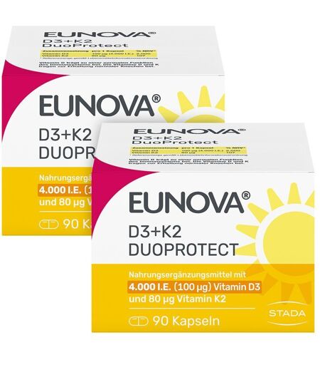 Nahrungsergänzungsmittel sind kein Ersatz für eine abwechslungsreiche und ausgewogene Ernährung und eine gesunde Lebensweise. EUNOVA® D3 + K2 DuoProtect – 4.000 I.E. FÜR IMMUNSCHUTZ UND KNOCHEN-POWER* Vitamin D unterstützt nicht nur die normale Funktion des Immunsystems, es ist auch wichtig für die Erhaltung normaler Knochen. Denn Knochen sind eine lebende Substanz und werden ständig neu aufgebaut, umgebaut und abgebaut. Während bis zum Alter von etwa 30 Jahren die Knochenmasse zunimmt, verringert sie sich danach altersbedingt um etwa ein Prozent pro Jahr. Durch den Abfall des Östrogenspiegels bei Frauen während beziehungsweise nach den Wechseljahren kann die Abnahme der Knochenmasse auf bis zu vier Prozent pro Jahr ansteigen.1 Doch der überwiegende Abbau von Knochenmasse ist nicht nur ein Problem älterer Frauen. Auch Männer sind betroffen. Es lohnt sich für beide Geschlechter, einem sich häufig schleichend entwickelnden Knochenschwund vorzubeugen. Um die Knochen zu unterstützen und optimal zu versorgen, ist insbesondere Vitamin D wichtig. Vitamin D fördert die Aufnahme und Verwertung von Calcium und sorgt so für eine gute Calciumversorgung des Knochens. *Die Vitamine D und K tragen zur Erhaltung normaler Knochen bei. Die Kombination der sich ergänzenden Vitamine D3 und K2 in einem Präparat ist im Hinblick auf die Ernährungsphysiologie sinnvoll. EUNOVA® DuoProtect leistet als 2-in-1-Nahrungsergänzungsmittel eine wertvolle Ergänzung zu einer gesunden Ernährung und bewussten Lebensweise. PRODUKTPROFIL Nur mit veganen oder vegetarischen Zutaten Ohne Gelatine Ohne Konservierungsstoffe Ohne künstliche Farbstoffe Gluten- und laktosefrei Zutaten: Füllstoff Mikrokristalline Cellulose, Hydroxypropylmethylcellulose, Verdickungsmittel Gummi arabicum, Saccharose, Stärke, Trennmittel Stearinsäure, pflanzliches Öl (Kokos und Palm in veränderlichen Gewichtsanteilen), Trennmittel Siliciumdioxid, Vitamin D3 (Cholecalciferol), Farbstoff Eisenoxidgelb, Vitamin K Nährwerte:Durchschnittliche Nährwerte:pro 1 Kapsel% NRV*Vitamin D34000 I.E. (100µg)2000%Vitamin K280 µg107%*Referenzmenge gemäß LebensmittelinformationsverordnungVerzehrempfehlung: 1 Kapsel am Tag zu einer beliebigen Mahlzeit mit etwas Wasser einnehmen. Die Einnahme zu einer öl- oder fetthaltigen Mahlzeit kann die Resorption positiv beeinflussen. Hinweis: Die angegebene empfohlene tägliche Verzehrmenge darf nicht überschritten werden.Aufbewahrung:Kühl (6-25 °C) und lichtgeschützt lagern. Außerhalb der Reichweite von kleinen Kindern aufbewahren.Nettofüllmenge: 2 x 90 KapselnHerstellerdaten:STADA Consumer Health Deutschland GmbHStadastraße 2-1861118 Bad Vilbel HÄUFIGE FRAGEN & ANTWORTEN Für wen ist EUNOVA® D3 + K2 DuoProtect – 4.000 I.E geeignet? EUNOVA® D3 + K2 DuoProtect – 4.000 I.E eignet sich zur kurzzeitigen intensiven Versorgung für Erwachsene. Wie lange sollte ich EUNOVA® D3 + K2 DuoProtect – 4.000 I.E einnehmen? EUNOVA® D3 + K2 DuoProtect – 4.000 I.E sollte nur als Anschubdosierung für 1-3 Monate... ...