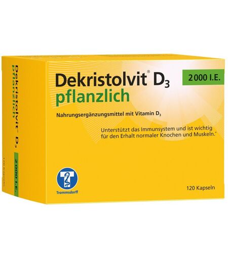 Nahrungsergänzungsmittel sind kein Ersatz für eine ausgewogene und abwechslungsreiche Ernährung und eine gesunde Lebensweise. Dekristolvit® D3 2000 I.E pflanzlich Ein ausgeglichener Vitamin D-Status ist von großer Bedeutung für die Gesundheit. Vitamin D ist nicht nur wichtig für die Knochen- und Muskelgesundheit, sondern hat viele weitere positive Wirkungen auf verschiedene andere Organsysteme im Körper. Das pflanzliche Vitamin D wird aus einer nachhaltigen Quelle von Flechten (Cladonia rangiferina) gewonnen Nahrungsergänzungsmittel mit 2000 I.E. Vitamin D3 (Cholecalciferol) pro Kapsel Immunsystem-Unterstützung* für den alltäglichen Vitamin-D-Bedarf 1 Kapsel täglich Ist vegan und frei von Gluten und Lactose Zutaten: Füllstoff: Cellulose, Trennmittel: Magnesiumcarbonat, Überzugsmittel: Hydroxypropylmethylcellulose, Apfelfasern (Malus domestica), Trennmittel: Mono- und Diglyceride von Speisefettsäuren, Rapsöl (Brassica napus subps. napus), Cholecalciferol, Antioxydationsmittel: Stark tocopherolhaltige Extrakte. Dieses pflanzliches Vitamin D wird aus einer nachhaltigen Quelle von Flechten (Cladonia rangiferina) gewonnen. Nährwertangaben: Inhaltsstoffe pro Kapsel NRV (%)* pro 2 Kapseln NRV (%)* Vitamin D3 50 µg (=2000 I.E.) 1000 100 µg (=4000 I.E.) 2000 * NRV (nutrient reference values) = Referenzmenge der täglichen Zufuhr gemäß Verordnung (EU) Nr. 1169/2011 Verzehrempfehlung: Erwachsene und Kinder ab 11 Jahren können täglich bis zu 2 Kapseln mit reichlich Flüssigkeit zu einer Mahlzeit einnehmen. Kinder bis 10 Jahre nehmen täglich 1 Kapsel mit reichlich Flüssigkeit zu einer Mahlzeit ein. Die angegebene empfohlene tägliche Verzehrsmenge darf nicht überschritten werden. Hinweise: Die angegebene empfohlene tägliche Tagesmenge darf nicht überschritten werden. Aufbewahrung: Kühl (6-25°C) und lichtgeschützt lagern. Außerhalb der Reichweite von kleinen Kindern aufbewahren. Nettofüllmenge: 120 St. Herstellerdaten: HÜBNER Naturarzneimittel GmbH Schloßstraße 11 – 17 79238 Ehrenkirchen Deutschland ...