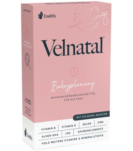 Nahrungsergänzungsmittel sind kein Ersatz für eine abwechslungsreiche und ausgewogene Ernährung und eine gesunde Lebensweise.Velnatal Babyplanung: Optimale Unterstützung für Frauen mit KinderwunschVelnatal® Babyplanung bietet eine gezielte Nährstoffversorgung für Frauen in der Kinderwunschphase. Mit hochwertigem Folat, wichtigen Vitaminen und Mineralstoffen unterstützt es den Körper optimal bei der Vorbereitung auf eine Schwangerschaft.Eine ausgewogene Nährstoffversorgung ist essenziell, um den weiblichen Körper auf die besonderen Anforderungen der Schwangerschaft vorzubereiten. Folat/Folsäure: Ein essenzielles Vitamin, das die Zellteilung und die Entwicklung des mütterlichen Gewebes unterstützt. Ein ausreichender Folatspiegel ist entscheidend, um Neuralrohrdefekten beim ungeborenen Kind vorzubeugen, und sollte bereits vor der Schwangerschaft gewährleistet sein. Das enthaltene Quatrefolic® ist das Glucosaminsalz des bioaktiven Folatwirkstoffes, dem (6S)-5-Methyltetrahydrofolat (5-MTHF), der eine besondere Bioverfügbarkeit aufweist. Vitamine und Mineralstoffe: Diese Kombination stärkt den Stoffwechsel und trägt zur Regulierung des Hormonhaushalts bei – wichtige Faktoren für die Unterstützung der Fruchtbarkeit. Besonders Vitamin B6 reguliert die Hormontätigkeit und Jod sorgt für eine gesunde Schilddrüsenfunktion. Gezielte Unterstützung: Entwickelt, um Frauen mit unerfülltem Kinderwunsch oder während der aktiven Babyplanungsphase optimal zu begleiten.Weitere Vorteile von Velnatal Babyplanung: Speziell abgestimmt auf die Bedürfnisse von Frauen in der Kinderwunschphase Praktische Kapselform für eine einfache Anwendung mit nur 1 Kapsel am Tag Laktosefrei und glutenfrei Gute Verträglichkeit GeschmacksneutralZusammensetzungZutaten: Öl aus der Mikroalge Schizochytrium sp. {T18), Gelatine (Rind), Feuchthaltemittel Glycerin, D-α-Tocopherylacetat, Nicotinamid, Trennmittel Siliciumdioxid, Calcium-D-pantothenat, Cyanocobalamin, Zinkoxid, Pyridoxinhydrochlorid, Riboflavin, Thiaminmononitrat, Cholecalciferol, (6S)-5-Methyltetrahydrofolat-Glucosaminsalz, Pteroylmonoglutaminsäure, Kaliumiodid, D-Biotin, Natriumselenit, Farbstoffe: Curcumin, Eisenoxid, Kaliumaluminiumsilikat.Nährwerte: Eine Weichkapsel (= tägliche Tagesverzehrempfehlung) enthält: Nährstoff Menge % NRV* Folat 600 μg 300% - Folsäure 400 μg - 5-MTHF-Glucosaminsalz 200 μg Jod 150 μg 100% Docosahexaensäure aus Algen 200 mg ** Thiamin (Vitamin B1) 1,2 mg 109% Riboflavin (Vitamin B2) 1,5 mg 107% Vitamin B6 1,9 mg 136% Vitamin B12 5,5 μg 220% Vitamin D 10 μg 200% Vitamin E 13 mg α-TE*** 108% Biotin 60 μg 120% Niacin (Vitamin B3) 16 mg NE**** 100% Pantothensäure (Vitamin B5) 6 mg 100% Selen 30 μg 55% Zink 5 mg 50% % der Referenzmenge gemäß Lebensmittelinformationsverordnung (EU) Nr. 1169/2011 ** keine Empfehlung in der Lebensmittelinformationsverordnung vorhanden *** TE = α-Tocopheroläquivalent **** NE = NiacinäquivalentVerzehrempfehlungTäglich eine Kapsel Velnatal® Babyplanung mit ausreichend Flüssigkeit... ...