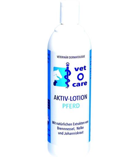 vet-o-care Aktiv-Lotion Pferd Die vet-o-care Aktiv-Lotion zieht schnell in die Haut ein, macht sie weich und geschmeidig ohne zu fetten und bildet einen Schutzfilm. Bewährt hat sich die vet-o-care Aktiv-Lotion Pferd insbesondere bei: Mauke Allerien Schürfwunden Satteldruck Sommerekzemen Sonnenbrand Anwendung: Mehrmals täglich auf die betroffenen Stellen auftragen und leicht einmassieren. Bei Bedarf bis zur Besserung wiederholen Inhaltsstoffe: Nelken-Extrakt, Brennessel-Extrakt, Kokosöl, Johanniskraut-Extrakt, ph-justiertes Wasser, Zitronensäure, Ammonium-Base ...