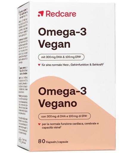 Nahrungsergänzungsmittel sind kein Ersatz für eine ausgewogene und abwechslungsreiche Ernährung und eine gesunde Lebensweise.Redcare Omega-3 vegan Omega-3-Fettsäuren gehören zu den mehrfach ungesättigten Fettsäuren, die essenziell für den Körper sind, da dieser sie nicht eigenständig produzieren kann. Sie sind bekannt für ihre Effekte auf die Gesundheit, insbesondere in Bezug auf Herz, Gehirn und Augen. Eine ausreichende Zufuhr von Omega-3 ist daher unerlässlich, um diese wichtigen Funktionen zu unterstützen. Die Redcare Omega-3 Vegan Kapseln bieten eine pflanzliche Alternative, die wertvolle Fettsäuren wie Eicosapentaensäure (EPA) und Docosahexaensäure (DHA) enthält. DHA und EPA leisten einen Beitrag zu einer normalen Herzfunktion. Die positive Wirkung stellt sich bei einer täglichen Aufnahme von 250 mg DHA und EPA ein. DHA leistet zusätzlich einen Beitrag zum Erhalt einer normalen Gehirnfunktion und Sehkraft. Die positive Wirkung stellt sich bei einer täglichen Aufnahme von 250 mg DHA Jede Kapsel beinhaltet hochwertiges veganes Omega-3 aus der Mikroalge Schizochytrium sp.. In zwei Kapseln stecken insgesamt 500 Milligramm Omega-3-Fettsäuren, davon 300 Milligramm DHA und 100 Milligramm EPA – so sind Sie optimal mit Omega-3 versorgt. Für die ideale Tagesdosis nehmen Sie täglich zwei Redcare Omega-3 Vegan Kapseln mit ausreichend Flüssigkeit ein, wahlweise morgens, mittags oder abends. Mit 80 Kapseln pro Packung sind Sie für 40 Tage bestens versorgt.Pflichtangaben Zutaten: DHA- und EPA-reiches Öl aus der Mikroalge Schizochytrium sp. (USA, 68 %), modifizierte Stärke, Festigungsmittel: Glycerin, Geliermittel: Carrageen, Säureregulator: Natriumphosphate, Antioxidationsmittel: stark tocopherolhaltige Extrakte Nährwerte: Nährstoffe 2 Kapseln 1* Algenöl davon Omega-3 Fettsäuren davon DHA davon EPA 1.000 mg 500 mg 300 mg 100 mg *angegebene tägliche VerzehrmengeVerzehrempfehlung: 2 Kapseln täglich mit ca. 200 ml Wasser einnehmenHinweis: Die empfohlene tägliche Verzehrmenge darf nicht überschritten werden. Dieses Produkt ist kein Ersatz für eine ausgewogene, abwechslungsreiche Ernährung und eine gesunde Lebensweise.Aufbewahrung:Außerhalb der Reichweite von kleinen Kindern aufbewahren. Kühl, trocken und dunkel lagern.Nettofüllmenge: 56 g (80 Kapseln) Herstellerdaten: Shop-Apotheke B.V. Erik de Rodeweg 11/13, 5975 WD SevenumNiederlande ...