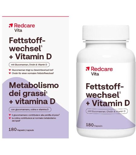 Redcare Vita Fettstoffwechsel + Vitamin D Möchten Sie Ihren Stoffwechsel1,2 und zugleich ihre Gewichtsabnahme3 unterstützen? Dann sind die Redcare Vita Fettstoffwechsel + Vitamin D Kapseln genau die richtige Wahl – die einzigartige Formel kombiniert das Beste zum Stoffwechsel-Support: Mit Cholin & Glucomannan aus der Konjakwurzel Zink und Eisen sowie den Spurenelementen Mangan und Molybdän Aus der Pflanzenwelt: Gingerole aus Ingwer Plus B-Vitamine wie B6, B12 und Folsäure Zusätzlich Hochdosiertes Vitamin D So unterstützt Redcare Vita Fettstoffwechsel + Vitamin D besonders den Stoffwechsel sowie den Gewichtsverlust: 1Cholin trägt zu einem normalen Fettstoffwechsel und einer normalen Leberfunktion bei. 2Zink trägt zu einem normalen Fettsäurestoffwechsel sowie einem normalen Stoffwechsel von Makronährstoffen bei. 3Glucomannan trägt im Rahmen einer kalorienarmen Ernährung zu Gewichtsverlust bei. (Die positive Wirkung stellt sich bei einer täglichen Aufnahme von 3 g Glucomannan in drei Portionen à 1 g in Verbindung mit 1 – 2 Gläsern Wasser vor den Mahlzeiten und im Rahmen einer kalorienarmen Ernährung ein.) Vitamin D und Calcium trägt zur Erhaltung einer normalen Muskelfunktion und normaler Knochen bei. Die Einnahme ist leicht: Einfach dreimal täglich zwei Kapseln täglich mit einem großen Glas Wasser am besten vor einer Mahlzeit einnehmen. Für eine optimale Wirkung achten Sie auf eine kalorienarme Ernährung. Eine Packung enthält 180 Kapseln und reicht für einen Monat. Pflichtangaben Zutaten: Glucomannan reiches Konjakwurzelpulver (Amorphophallus konjac, Sulphite, China), Magnesiumcarbonat, Cholintartrate (mikroverkapselt), Überzugsmittel: Hydroxypropylmethylcellulose, Eisensulfat (mikroverkapselt), Calcium-L-Ascorbat, Menachinon-7, Ingwerwurzelstockextrakt (Zingiber officinale), Zinkcitrat, Natriummolybdat, Cholecalciferol, Cyanocobalamin, Mangangluconat, Pyridoxinhydrochlorid, (6S)-5-Methyltetrahydrofolsäure, Glucosaminsalz Nährwerte: Nutrient Amount (6 Kapseln)4 % Daily Value (NRV)5 Vitamin D20 μg400 % Vitamin K50 μg67 % Vitamin C66 mg83 % Vitamin B61,2 mg86 % Folsäure48 μg24 % Vitamin B126 μg240 % Magnesium60 mg16 % Eisen12 mg86 % Zink5,0 mg50 % Mangan0,5 mg25 % Molybdän50 μg100 % Cholin82,5 mg– Gingerole1,2 mg– Glucomannan3,0 g– 4 angegebene tägliche Verzehrmenge 5 Anteil an der Nährstoffreferenzmenge Verzehrempfehlung: Im Rahmen einer kalorienarmen Ernährung täglich 3x jeweils 2 Kapseln vor den Mahlzeiten mit je 200 ml Wasser einnehmen. Hinweis: Die angegebene empfohlene Tagesmenge darf nicht überschritten werden. Dieses Produkt ist kein Ersatz für eine ausgewogene, abwechslungsreiche Ernährung und eine gesunde Lebensweise. Produkt darf nicht von Schwangeren, Kindern und Jugendlichen unter 18 Jahren verzehrt werden. Patient*innen, die Antikoagulantien einnehmen, sollten vor der Einnahme von Vitamin K-Präparaten ihre Ärztin oder ihren Arzt konsultieren. Bei unzureichender Flüssigkeitszufuhr besteht bei Verbraucher*innen mit Schluckbeschwerden... ...