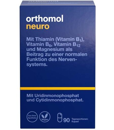 Nahrungsergänzungsmittel sind kein Ersatz für eine ausgewogene und abwechslungsreiche Ernährung und eine gesunde Lebensweise. Zentrales und peripheres Nervensystem Das Nervensystem bezeichnet die Gesamtheit aller Nerven im menschlichen Körper. Man unterscheidet das zentrale und das periphere Nervensystem. Das zentrale Nervensystem umfasst Gehirn und Rückenmark. Zum peripheren Nervensystem gehören alle Nerven im gesamten Körper außerhalb des Gehirns und Rückenmarks. Damit das periphere Nervensystem in der richtigen Geschwindigkeit und Komplexität arbeiten kann, ist es wichtig, dass die peripheren Nerven regenerieren. Für die Nervenregeneration werden Zellfragmente des geschädigten Nervs zunächst entfernt, bevor dieser wieder wachsen und das Axon neu aufgebaut werden kann. Die Nervenregeneration ist im gesamten Körper wichtig. Besonders relevant für den Alltag sind der Nacken- und Rückenbereich, die Beine und Füße sowie die Hände. Was braucht es für die Nervenregeneration? Zum Wiederaufbau des Nervs werden viele Stoffe benötigt. Um diese bereitzustellen, braucht es eine gute Versorgung des Körpers mit allen wichtigen Mikronährstoffen und weiteren Bausteinen. Untersuchungen der vergangenen Jahrzehnte konnten zeigen, dass insbesondere die Vitamine B1, B6 , B12 sowie der Mineralstoff Magnesium die normale Funktion und den Regenerationsprozess von Nerven unterstützen können. So spielt Vitamin B12 eine Rolle bei der Bildung von Myelin als Schutzschicht um die Nerven. Vitamin B1 trägt zum normalen Energiestoffwechsel der Zellen bei. Auch die Nukleoside Uridin und Cytidin, die Teil der Ribonukleinsäure (RNS) sind, sind am Wiederaufbau des Nervenzellfortsatzes und der Schutzschicht beteiligt. Damit alle Bausteine zur Nervenregeneration vorliegen, sollte auf eine ausgewogene Ernährungsweise geachtet werden. Die B-Vitamine und Magnesium kommen auf natürliche Weise in Lebensmitteln vor. Orthomol Neuro Da Mikronährstoffe für die Regeneration und normale Funktion des Nervensystems besonders wichtig sind, ist eine ausreichende Versorgung mit Vitamin B1, Vitamin B6 , Vitamin B12 und Magnesium notwendig. Auf die richtige Mikronährstoffkombination kommt es an Die Mikronährstoffe ergänzen sich in ihrer Funktion. Daher ist es sinnvoll, sie in ausgewogener Kombination aufzunehmen. Orthomol Neuro basiert auf wissenschaftlichen Erkenntnissen und enthält Mikronährstoffe, die für die normale Funktion des Nervensystems benötigt werden. Orthomol Neuro. Bereit. Fürs Leben. Orthomol Neuro ist ein Nahrungsergänzungsmittel. Es enthält wichtige Mikronährstoffe für die normale Funktion des Nervensystems. Nur eine Kapsel täglich. Als 30er- und 90er-Packung erhältlich. Orthomol Neuro: Mehr von Orthomol entdecken Zutaten: Magnesiumoxid, Natriumsalze von Uridinmonophosphat (UMP), Überzugmittel Hydroxypropylmethylcellulose, Füllstoff mikrokristalline Cellulose, Cytidinmonophosphat (CMP), Trennmittel Magnesiumsalze der Speisefettsäuren, Färberdistel, Thiaminhydrochlorid,... ...