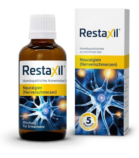 RESTAXIL®: 5-fach-Wirkkomplex gegen Nervenschmerzen RESTAXIL® ist ein zugelassenes Arzneimittel zur Behandlung von Nervenschmerzen (Neuralgien). Diese können an unterschiedlichen Stellen im Körper auftreten. Häufig äußern sie sich zum Beispiel in Form von (chronischen) Rückenschmerzen, muskelkaterähnlichen Schmerzen (Fibromyalgie) oder Missempfindungen in Beinen und Füßen (Diabetische Polyneuropathie). Die Auslöser der Schmerzen sind meist bei allen gleich: geschädigte oder gereizte Nerven. Bisher griffen Betroffene häufig zu herkömmlichen Schmerzmitteln. Das Überraschende: Diese wirken bei Nervenschmerzen selten. Das bestätigen auch Mediziner der Deutschen Gesellschaft für Neurologie. Der Grund ist, dass diese Schmerzmittel hauptsächlich Entzündungen bekämpfen. Die Schmerzursache bei Nervenschmerzen sind aber nicht Entzündungen, sondern Schädigungen der Nervenbahnen. Die gute Nachricht: RESTAXIL (Apotheke, rezeptfrei) wirkt anders, denn es setzt an den geschädigten Nerven an. Das Geheimnis hinter RESTAXIL®? Die zugelassenen Arzneitropfen enthalten eine spezielle Kombination aus fünf Wirkstoffen, die eigentlich dafür bekannt sind, die Nerven zu reizen. Wissenschaftler fanden aber heraus: In einer speziellen Dosierung bewirken diese genau das Gegenteil. Die Wirkstoffe setzen gezielt Reize im Körper. Dadurch erkennt er die Störungen im Organismus und beginnt, die geschädigten Nerven zu regenerieren. Effektive Wirkung bei bester Verträglichkeit Ein weiterer Vorteil von RESTAXIL®: Die Arzneitropfen haben keine bekannten Nebenwirkungen. Auch sind Wechselwirkungen mit anderen Medikamenten nicht bekannt. RESTAXIL® kann deshalb längerfristig und begleitend zu anderen Therapieformen eingesetzt werden. Eine gute Wahl bei allen Schmerzarten, die durch geschädigte Nerven ausgelöst werden! Wie nehme ich RESTAXIL ein? RESTAXIL Tropfen sind sehr gut verträglich und eignen sich deshalb auch für eine längerfristige Einnahme*. Bei chronischen Schmerzen: tägliche Einnahme von 3x je 5-10 Tropfen. In Zeiten von akuten Schmerzen kann die Dosierung auf bis zu 12x täglich je 5-10 Tropfen erhöht werden. Was Restaxil® enthält Die Wirkstoffe sind Gelsemium sempervirens Dil. D2, Spigelia anthelmia Dil. D2, Iris versicolor Dil. D2, Cyclamen purpurascens Dil. D3 und Cimicifuga racemosa Dil. D2. Restaxil® enthält 18 Vol.-% Alkohol Pflichtangaben RESTAXIL®. Wirkstoffe: Gelsemium sempervirens Dil. D2, Spigelia anthelmia Dil. D2, Iris versicolor Dil. D2, Cyclamen purpurascens Dil. D3, Cimicifuga racemosa Dil. D2. Homöopathisches Arzneimittel bei Neuralgien (Nervenschmerzen). Zu Risiken und Nebenwirkungen lesen Sie die Packungsbeilage und fragen Sie Ihren Arzt oder Apotheker. PharmaFGP GmbH, 82166 Gräfelfing ...