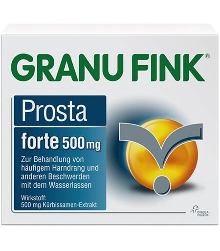 Pflanzliches Arzneimittel zur Behandlung von Prostata-Blasenbeschwerden. GRANU FINK® Prosta forte 500 mg wirkt stark, hilft natürlich dank hochdosiertem Uromedic® Kürbissamen mit prostata-aktiven Delta-7-Sterolen. Eine Besserung des häufigen Harndrangs und des schwachen Harnstrahls ist schon nach 4 Wochen spürbar. Dabei schont GRANU FINK® Prosta forte 500 mg die Sexualfunktion. Das Arzneimittel verbindet klinisch bewiesene Wirksamkeit *1 mit sehr guter Verträglichkeit. Reduziert häufigen Harndrang Stärkt den Harnstrahl Schont die Sexualfunktion Wie ist GRANU FINK® Prosta forte 500 mg einzunehmen? Nehmen Sie dieses Arzneimittel immer genau wie in dieser Packungsbeilage beschrieben bzw. genau nach der mit Ihrem Arzt oder Apotheker getroffenen Absprache ein. Fragen Sie bei Ihrem Arzt oder Apotheker nach, wenn Sie sich nicht sicher sind. Erwachsene Die empfohlene Dosis beträgt 2-mal täglich 1 Hartkapsel GRANU FINK® Prosta forte 500 mg. Bitte nehmen Sie die Hartkapsel vor einer Mahlzeit mit etwas Flüssigkeit ein. Die Dauer der Einnahme ist prinzipiell nicht begrenzt. Eine regelmäßige und längerfristige Einnahme wird empfohlen. Kinder und Jugendliche Die Anwendung bei Kindern und Jugendlichen ist aufgrund des Anwendungsgebietes nicht vorgesehen. Was GRANU FINK® Prosta forte 500 mg enthält Der Wirkstoff ist: Dickextrakt aus Kürbissamen. Eine Hartkapsel enthält 500 mg Dickextrakt aus Kürbissamen (15–25 : 1), Auszugsmittel Ethanol 92 % (m/m). Die sonstigen Bestandteile sind: Siliciumdioxid, methyliert, Gelatine, Natriumdodecylsulfat, gereinigtes Wasser, Eisen(III)-oxid (E 172), Eisen(II, III)-oxid (E 172), Eisen(III)-hydroxid-oxid (E 172). Pflichttext: GRANU FINK® Prosta forte 500 mg Wirkstoff: Dickextrakt aus Kürbissamen Anwendungsgebiete: Pflanzliches Arzneimittel bei Beschwerden beim Wasserlassen infolge einer Vergrößerung der Prostata (Prostataadenom Stadium I bis II nach Alken bzw. Stadium II bis III nach Vahlensieck). Das Vorliegen einer schwerwiegenden Grunderkrankung als Ursache für die Beschwerden muss vor der Behandlung von einem Arzt ausgeschlossen worden sein. Dieses Arzneimittel wird angewendet bei erwachsenen Männern ab 18 Jahren. Zu Risiken und Nebenwirkungen lesen Sie die Packungsbeilage und fragen Sie Ihre Ärztin, Ihren Arzt oder in Ihrer Apotheke. ...