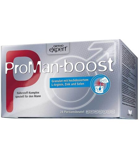 Nahrungsergänzungsmittel sind kein Ersatz für eine ausgewogene und abwechslungsreiche Ernährung und eine gesunde Lebensweise.Nährstoff-Formel speziell für den Mann. Nahrungsergänzungsmittel mit L-Arginin, Coenzym Q10, Vitaminen, Zink und Selen. Mit Zucker und Süßungsmittel. Wenn Sie Ihrem Liebesleben einen Schub geben wollen. Ein erfülltes Sexualleben ist ein Glücksbringer. Orthoexpert® ProMan-boost ist der Booster für Ihr Liebesleben. Orthoexpert® ProMan-boost enthält 8 speziell kombinierte Mikronährstoffe plus die essentielle Aminosäure L-Arginin für den Mann.L-Arginin ist eine Aminosäure mit wichtiger Funktion für die Gefäß- erweiterung. So kann das für eine Erektion benötigte Blut in die Schwellkörper fließen.Testosteron ist das Sexualhormon des Mannes. Im Laufe der Jahre nimmt die Testosteronproduktion auf natürliche Weise ab und be- einflusst so auch die männliche Libido. Das in Ortho- expert® ProMan-boost enthaltene Zink trägt zur Erhaltung eines normalen Testosteronspiegels im Blut bei.Das können Sie zusätzlich für einen höheren Testosteron- spiegel tun: Seien Sie sportlich aktiv, um Fett ab- und Muskeln aufzubauen Trainieren Sie dabei kurz und intensiv, statt zu lang Sagen Sie ja zu Proteinen in Fleisch, Fisch und Nudeln Lassen Sie sich vom Stress nicht stressen und genießen Sie ausreichend Schlaf Zur gezielten Unterstützung des Energiestoffwechsels enthält Orthoexpert® ProMan-boost die Vitamine B2, B6 und Vitamin B12. Zudem unterstützt das in Orthoexpert® ProMan-boost enthaltene Selen eine normale Spermabildung.Orthoexpert® ProMan-boost ist eine Nährstoff-Formel mit hochdosiertem L-Arginin, Zink und Selen speziell für den Mann.Immer gut versorgt mit unseren Orthoexpert®-Produkten.Für eine ausreichende Versorgung mit Nährstoffen ist eine ausgewogene Ernährung sehr wichtig. In verschiedenen Lebenssituationen besteht aber häufig ein erhöhter Bedarf an Nährstoffen wie Vita- minen und Mineralstoffen. Jedes einzelne Orthoexpert®-Produkt ist jeweils abgestimmt auf die unterschiedlichen Bedürfnisse. Die gezielten Kombinationen und hohen Dosierungen basieren auf ernährungswissenschaftlichen Erkenntnissen. Zutaten: Zucker; Säuerungsmittel: Citronensäure; L-Arginin; Aromen; Vitamin E; Zinkcitrat; Coenzym Q10; Süßungsmittel: Steviolglycoside; Natriumselenit; Vitamin B2; Vitamin B6; Folsäure; Vitamin B12.Nährwerte: Durchschnittliche Nährwerte pro 1 Portionsbeutel (=Tagesportion) % NRV* L-Arginin 2 g - Coenzym Q10 30 mg - Vitamin B2 5,0 mg 357 Vitamin B6 5,0 357 Vitamin B12 6,0 μg 240 Folsäure 500 μg 250 Vitamin E (alpha-TE**) 40 mg 333 Selen 50 μg 91 Zink 10 mg 100 *nach Nährwert-Kennzcihnungsverordnung**TE=TocopheroläquivalenteMikronährstoffe und Ihre Funktionen Zutaten Leistung L-Arginin Aminosäure mit wichtiger Funktion für die Gefäßerweiterung Zink trägt zur Erhaltung eines normalen Testosteronspiegels im Blut bei Selen trägt zur Erhaltung eines normalen Testosteronspiegels im Blut bei unterstützt eine normale... ...