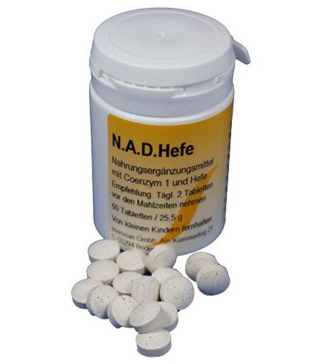 Nahrungsergänzungsmittel sind kein Ersatz für eine ausgewogene und abwechslungsreiche Ernährung und eine gesunde Lebensweise.N.A.D. HefeCoenzym 1, das auch als Nicotinamid-Adenin-Dinucleotid bezeichnet wird, kommt in jeder Zelle natürlicherweise vor. NAD ist die oxidierte, NADH die reduzierte Form des Coenzym 1. Coenzym 1 ist an mehreren 100 verschiedenen enzymatischen Redox-Reaktionen in der Zelle beteiligt. Seine Hauptaufgabe ist die Aufnahme des während einer enzymatischen Reaktion freigesetzten Wasserstoffs. Coenzym 1 ermöglicht häufig erst den normalen Ablauf einer biochemischen Reaktion.Jedes in einer Zelle vorhandene Molekül Coenzym 1 wird ständig von der oxidierten in die reduzierte Form umgewandelt und wieder zurück. Bei der Glykolyse (Kohlenhydratabbau) wird NAD zu NADH umgewandelt und in der Atmungskette stellt NADH den Wasserstoff für die energieliefernden Schritte wieder bereit. Nach kurzer Zeit stellt sich ein Gleichgewicht zwischen NAD und NADH ein. In vivo liegt das Coenzym überwiegend in der oxidierten Form vor.Bei der alimentären Zufuhr ist es unerheblich, ob der Körper seine Versorgung mit Coenzym 1 über die Einnahme von NAD oder NADH sicherstellt. Es kommt einzig und allein darauf an, ob Coenzym 1 im Darm gut resorbiert wird und den Zellen dann zur Verfügung steht.Wichtigster Lieferant des Coenzym 1 in der Ernährung sind Fleisch, Fisch und Hefen. Ein Großteil des als Niacin bezeichneten Vitamins stammt dabei aus dem Coenzym 1, weshalb es auch die gleiche Vitaminwirkung wie Nikotinsäure und Nikotinamid hat. In der Vitaminwirkung liegt der Hauptgrund für eine regelmäßige Einnahme.Für Coenzym 1 gibt es bisher noch keine allgemein gültigen Empfehlungen für eine Tageseinnahme. Zur Aufrechterhaltung der Zellfunktionen scheint aber eine täglich Zufuhr von 5 mg in Form von Niacin sinnvoll.Zutaten:Trägerstoff Mikrokristalline Cellulose, Niacinamid, Füllstoff Bierhefe, Trennmittel Magnesium Trisilikat, Magnesiumstearat (pflanzl.)Frei von Laktose und GlutenNährwerte:Durchschnittliche Nährwertepro 2 TablettenRDA*Vitamin B3 - Niacin10 mg63 %*RDA = Wert des empfohlenen Tagesbedarfs gem. EU-RichtlinienVerzehrempfehlung: Zweimal täglich 1 - 2 Tabletten vor oder zu den Mahlzeiten nehmenHinweis: Die angegebene tägliche Verzehrmenge darf nicht überschritten werden. Sprechen Sie bei Erkrankeungen immer zuerst mit Ihrem Arzt, bevor Sie Ergänzungsmittel nehmen. Aufbewahrung:Kühl (6-25 °C) und lichtgeschützt lagern. Außerhalb der Reichweite von kleinen Kindern aufbewahren.Nettofüllmenge:60 Tabletten = 25,5 gHerstelledaten:merosan Diätvertrieb GmbHAm Kümmerling 21-2555294 Bodenheim ...