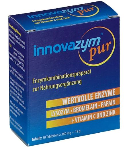 Nahrungsergänzungsmittel sind kein Ersatz für eine abwechslungsreiche und ausgewogene Ernährung und eine gesunde Lebensweise.innovazym® PurZutaten: Füllstoffe: Isomalt, Maltodextrin, L-Ascorbinsäure, Papain (14,8 %), Papayafruchtpulver, Füllstoffe: mikrokristalline Cellulose und Hydroxypropylmethylcellulose, Bromelain (6,5 %), Lysozymhydrochlorid (1,2 %) aus Ei, Trennmittel: Stearinsäure, Talkum, Magnesiumsalze der Speisefettsäuren und Siliciumdioxid; Zinkcitrat, Polyfructose, Verdickungsmittel: Gummi Arabicum, pflanzliches Öl (aus Elaeis guineensis L. und Cocos nucifera L.). Nährwertangaben Pro 100 g Brennwert 1122,0 kJ / 267,62 kcal Fett 1,8 g davon gesättigte Fettsäuren 1,5 g Kohlenhydrate 53,2 g davon Zucker 11,7 g davon mehrwertige Alkohole 28,2 g Eiweiß 7,2 g Salz 0,02 g Bromelain 4754,0 mg Papain 11889,0 ng Lysozym 1190,0 mg Zink 388,4 mg Vitamin C 11872,0 mg Verzehrempfehlung:Über den Tag verteilt 7 Tabletten auf nüchternen Magen 1 Stunde vor dem Essen bzw. 3 Stunden nach dem Essen mit reichlich kalter Flüssigkeit einnehmen.Unser Tipp:Morgens 3 Tabletten abends 4 Tabletten.Hinweise: Die angegebene empfohlene tägliche Verzehrmenge darf nicht überschritten werden.Aufbewahrung:Außerhalb der Reichweite von kleinen Kindern trocken lagern.Nettofüllmenge: 50 Tabletten magensaftresistentHerstellerdaten: innovavital GmbH Mitterbachweg 483224 Grassau ...