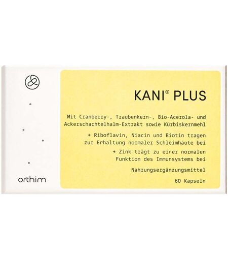 Nahrungsergänzungsmittel sind kein Ersatz für eine ausgewogene und abwechslungsreiche Ernährung und eine gesunde Lebensweise. Kani® plus + NAHRUNGSERGÄNZUNG – die Kapsel mit Cranberry-, Traubenkern-, Bio-Acerola- und Ackerschachtelhalm-Extrakt sowie Kürbiskernmehl; Riboflavin, Niacin, Biotin und Zink FUNKTION – unterstützt die Blasengesundheit – Riboflavin, Niacin und Biotin tragen zur Erhaltung normaler Schleimhäute bei, Zink trägt zur normalen Funktion des Immunsystems bei EIGENSCHAFTEN – die Kapsel ist vegan, lactose- und glutenfrei ANWENDUNG – 2 x täglich 1 Kapsel unzerkaut mit ausreichend Flüssigkeit eine Stunde vor der Mahlzeit einnehmen QUALITÄT – natürliche Vitalstoffe Made in Germany Die Blase, ein Organ, das uns täglich auf Trab hält und durchaus unseren Alltag bestimmen kann. Wer Probleme mit der Blase hat, verspürt mitunter einen hohen Leidensdruck. Probleme mit der Blase können theoretisch jeden treffen, Frauen aufgrund ihrer Anatomie und ihres Hormonhaushalts jedoch deutlich häufiger. Auslöser sind in den meisten Fällen Bakterien, die sich an die Schleimhäute haften und dort für Entzündungen sorgen. Leider ist dies bei den Betroffenen keine einmalige Angelegenheit, sondern tritt wiederholt (als Rezidive) auf. Bei einer schwachen Abwehrlage haben Bakterien ein leichtes Spiel. Es ist also wichtig, die Blase zu kräftigen und die Schleimhaut der Blase zu stärken. KANI® PLUS unterstützt durch die ideale Kombination aus Cranberry-, Traubenkern-, Bio-Acerola- und Ackerschachtelhalm-Extrakt sowie Kürbiskernmehl + Riboflavin, Niacin und Biotin, die zur Erhaltung normaler Schleimhäute beitragen und Zink für eine normale Funktion des Immunsystems. Zutaten: Kapselhüllsubstanz: Hydroxypropylmethylcellulose; Füllstoff: Cellulose (mikrokristallin); Kürbiskernmehl (19,2 %); Cranberry-Extrakt (18,4 %); Bio Acerola-Extrakt (13,5 %); Bio Ackerschachtelhalm-Extrakt (12,8 %); Traubenkern-Extrakt (7,7 %); Zinkgluconat; Nicotinamid; Vitamin B2; Biotin; Trennmittel: Siliciumdioxid Nährwerte: Durchschnittliche Nährwerte: pro Kapsel pro 2 Kapseln NRV* Zink 1,5 mg 3 mg 30 Nicotinamid 8 mg 16 mg 100 Vitamin B2 0,7 mg 1,4 mg 100 Biotin 0,05 mg 0,1 mg 200 Kürbiskernmehl 75 mg 150 mg ** Cranberry-Extrakt (18,4 %) enthält Proanthocyanidine (PAC) 72 mg 18 mg 144 mg 36 mg ** Bio Acerola-Extrakt (13,5 %) enthält Vitamin C 52,94 mg 7,2 mg 105,84 mg 14,4 mg ** 18 Bio Ackerschachtelhalm-Extrakt (12,8 %) enthält Kieselsäure 50 mg 7,14 mg 100 mg 14,28 mg ** Traubenkern-Extrakt (7,7 %) enthält (OPC) 30 mg 28,5 mg 60 mg 57 mg ** * Prozentsatz des Referenzwertes gemäß LMIV (NRV) ** keine Empfehlung der LMIV vorhanden Verzehrsempfehlung: 2 x täglich 1 Kapsel unzerkaut mit reichlich Flüssigkeit eine Stunde vor den Mahlzeiten verzehren. Aufbewahrung: Kühl (6-25 °C) und lichtgeschützt lagern. Außerhalb der Reichweite von kleinen Kindern aufbewahren. Hinweise: Die angegebene empfohlene tägliche Verzehrsmenge darf nicht überschritten werden. Das Produkt kühl, trocken und außerhalb... ...