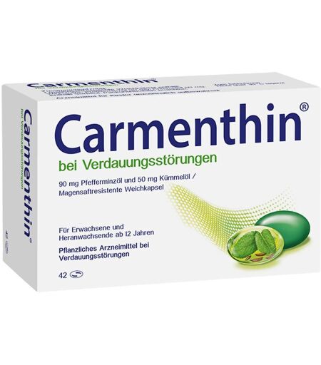 Carmenthin® bei Blähungen, Völlegefühl und Bauchschmerzen Immer wiederkehrende Magen-Darm-Beschwerden mit Blähungen, Völlegefühl und Schmerzen können Betroffene, insbesondere in Alltagssituationen, stark belasten. Oft handelt es sich um funktionelle Magen-Darm-Störungen, ohne organische Ursache. Hier hilft Carmenthin®. Einzigartige Wirkstoffkombination aus Pfefferminzöl und Kümmelöl Das pflanzliche Arzneimittel Carmenthin® enthält eine einzigartige Wirkstoffkombination aus Pfefferminzöl und Kümmelöl und lindert so gezielt Blähungen, Völlegefühl und Schmerzen: Pfefferminzöl wirkt krampflösend und schmerzlindernd, Kümmelöl wirkt entblähend und hemmt die Gasbildung. Die magensaftresistente Weichkapsel löst sich gezielt im Darm Eine spezielle, magensaftresistente Kapsel transportiert die Wirkstoffe geschützt in den Darm und setzt sie somit erst dort frei, wo die Beschwerden oft auch entstehen. Das ermöglicht ein hohes Maß an Wirksamkeit und Verträglichkeit, auch bei längerer Anwendung. Besser als Tee trinken Die Wirkstoffkombination aus Pfefferminzöl und Kümmelöl in Carmenthin® ist hochdosiert. Zum Vergleich: Um die Konzentration und Wirksamkeit der Wirkstoffe der Pfefferminze und des Küm mels aus 2 Kapseln Carmenthin® zu erreichen, müssten Sie täglich rund 11 Liter, also 73 Tassen Pfefferminz- und Küm mel-Tee trinken. Lindert wiederkehrende Beschwerden langfristig* und schonend Treten Magen-Darm-Beschwerden regelmäßig auf, liegt das meist an einer gestörten Verdauungsfunktion. Diese langfristig wieder ins Lot zu bringen, erfordert etwas Geduld und Durchhaltevermögen. Carmenthin® kann Sie hierbei unterstützen: Längerfristig eingenommen entspannt Carmenthin® den gestressten Magen-Darm-Bereich und beseitigt unangenehme Beschwerden nachhaltig. Wissenschaftliche Studien bestätigen: Die schmerzlindernde, entkrampfende sowie beruhigende Wirkung verstärkt sich bei längerer Einnahme. Die nachgewiesen gute Verträglichkeit von Carmenthin® ermöglicht eine individuelle Anpassung der Therapiedauer auf Ihre Bedürfnisse. Wir empfehlen die Einnahme über 1-3 Wochen, wodurch Sie Ihren Behandlungserfolg stufenweise beobachten können. Carmenthin® richtig einnehmen Die Dosierung ist 2-mal täglich 1 Kapsel, morgens und mittags mind. 30 Minuten vor dem Essen. Carmenthin® kann auch ohne eine darauffolgende Mahlzeit eingenommen werden. Eine erste Wirkung ist nach 1 - 1,5 h spürbar, sobald sich die magensaftresistente Kapsel im Darm aufgelöst hat. * Bei längerfristiger Einnahme. Pflichttext: Carmenthin® bei Verdauungsstörungen. Anwendungsgebiete: Dyspeptische Beschwerden, besonders mit leichten Krämpfen im Magen-Darm-Bereich, Blähungen, Völlegefühl. Zu Risiken und Nebenwirkungen lesen Sie die Packungsbeilage und fragen Sie Ihre Ärztin, Ihren Arzt oder in Ihrer Apotheke. Dr. Willmar Schwabe GmbH & Co. KG - Karlsruhe ...