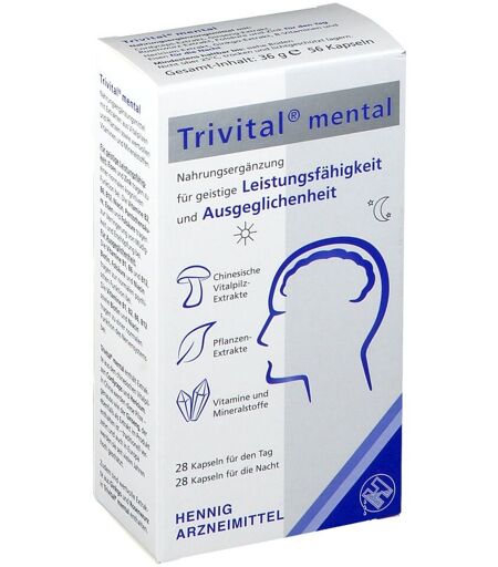 Nahrungsergänzungsmittel sind kein Ersatz für eine abwechlungsreiche und ausgewogene Ernährung und eine gesunde Lebensweise.Trivital® mentalZutaten: Kapsel Tag:Cordyceps-Extrakt (29%); Rosenwurz-Extrakt (22%); Füllstoff Hydroxypropylmethylcellulose; Ginseng-Extrakt (14%); Zinkgluconat; Füllstoff Cellulose; Farbstoffe und Birlliantblau FCF; Folsäure. pro Kapsel (Tag)% der Tageszufuhr*Cordyceps-Extrakt200 mg**Ginseng-Extrakt100 mg**Rosenwurz-Extrakt150 mg**Folsäure400 µg200 %Zink10 mg100 %Kapsel Nacht:Hericium-Extrakt (48%); Füllstoff Hydroxypropylmethylcellulose; Ginkgo-Extrakt (13%); Eisen (II)-gluconat; Nicotinamid; Calcium-D-Pantothenat; Thiaminhydrochlorid; Riboflavin; Pyridoxinhydrochlorid; Cyanocobalamin; Biotin; Farbstoffe und Brilliantblau FCF. pro Kapsel (Nacht)% der Tageszufuhr*Hericium-Extrakt300 mg**Ginkgo-Extrakt80 mg**Vitamin B12,2 mg200 %Vitamin B22,8 mg200 %Vitamin B62,8 mg200 %Vitamin B125,0 µg200 %Niacin32 mg NE200 %Pantothensäure12 mg200 %Biotin100 µg200 %Eisen7,0 mg50 %* Referenzmenge nach Lebensmittelinformationsverordnung** keine Referenzmenge nach Lebensmittelinformationsverordnung vorhandenVerzehrempfehlung:Täglich 1 Kapsel morgens mit 1/2 Glas Wasser zum Essen einnehmen.Täglich 1 Kapsel abends mit 1/2 Glas Wasser zum Essen einnehmen.Hinweis:Die angegebene empfohlene tägliche Verzehrmenge darf nicht überschritten werden.Aufbewahrung:Nicht über 25°C, trocken und lichtgeschützt lagern.Nettofüllmenge:28 TagesportionenHerstellerdaten:HENNIG ARZNEIMITTELLiebigstraße 1-265439 Flörsheim am MainDEUTSCHLAND ...