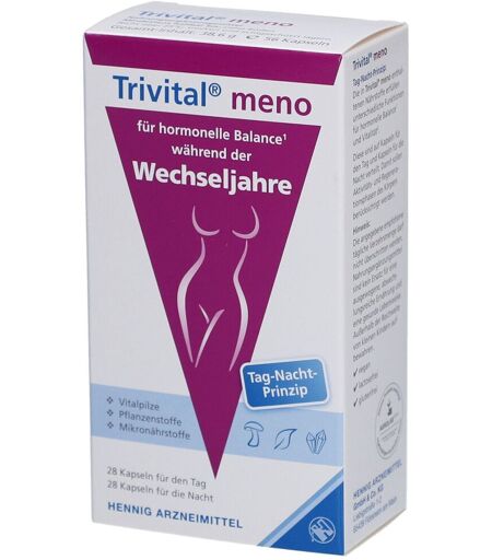 Nahrungsergänzungsmittel sind kein Ersatz für eine abwechslungsreiche und ausgewogene Ernährung und eine gesunde Lebensweise.Trivital® menoZutaten: Kapsel Tag:Cordyceps-Extrakt (28,5%); Yamswurzel-Extrakt (21,5%); Füllstoffe Cellulose und Hydroxypropylmethylcellulose; Melissen-Extrakt (7,2%); Coenzym Q10 (3,5%); Farbstoffe ; Eisenoxide und Eisenhydroxide. pro Kapsel (Tag)% der Tageszufuhr*Cordyceps-Extrakt200 mg**Yamswurzel-Extrakt150 mg**Melissen-Extrakt50 mg**Coenzym Q1025 mg**Kapsel Nacht:Maitake-Extrakt (31%); Eisen(II)-gluconat; Füllstoffe Hydroxypropylmethylcellulose und Cellulose; Soja-Extrakt (7,7%); Rotklee-Extrakt (7,7%); Nicotinamid; Calcium-D-Pantothenat; Riboflavin; Pyridoxinhydrochlorid; Cyanocobalamin; Farbstoffe , Allurarot AC (Kann Aktivität und Aufmerksamkeit bei Kindern beeinträchtigen) und Birlliantblau FCF. pro Kapsel (Nacht)% der Tageszufuhr*Maitake-Extrakt200 mg**Soja-Extrakt50 mg**Rotklee-Extrakt50 mg**Vitamin B61,4 mg100 %Niacin16 mg NE100 %Pantothensäure6,0 mg100 %Vitamin B21,4 mg100 %Vitamin B122,5 µg100 %Eisen14 mg100 %* Referenzmenge nach Lebensmittelinformationsverordnung** keine Referenzmenge nach Lebensmittelinformationsverordnung vorhandenVerzehrempfehlung:Täglich 1 Kapsel morgens mit 1/2 Glas Wasser zum Essen einnehmenTäglich 1 Kapsel abends mit 1/2 Glas Wasser zum Essen einnehmenHinweis:Die angegebene empfohlene Tagesmenge darf nicht überschritten werden.Aufbewahrung: Kühl (6-25 °C) und lichtgeschützt lagern. Außerhalb der Reichweite von kleinen Kindern aufbewahren.Nettofüllmenge:37,5 g à 56 Kapseln - 28 Kapseln Tag (19,5 g), 28 Kapseln Nacht (18 g)Herstellerdaten:HENNIG ARZNEIMITTELLiebigstraße 1-265439 Flörsheim am MainDEUTSCHLAND ...