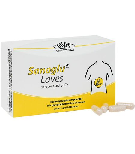 Bitte achten Sie auf eine abwechslungsreiche und ausgewogene Ernährung und gesunde Lebensweise. Sanaglu® Laves ist eine Kombination aus eiweißabbauenden Enzymen (Exo- und Endopeptidasen), die sowohl Gluten als auch konkurrierende Eiweiße schnell abbauen.Die aus natürlich vorkommenden Mikroorganismen (Aspergillus niger, Bacillus subtilis) gewonnenen Enzyme sind bereits im Magen aktiv und über einem breiten pH-Bereich stabil.Sanaglu® Laves enthält keine Laktose, Gluten oder Konservierungsmittel.Zutaten:Proteasen: Protease 3.0 (29 % entsprechend 500 SAPU pro Kapsel), Protease (24 % entsprechend 75.000 HUT pro Kapsel), Dipeptidylpeptidase DPPIV (6 % entsprechend 125 DPPIV pro Kapsel) , Maltodextrin, Trennmittel Glyceride von Fettsäuren, Hydroxypropylmethylcellulose, WasserNährwerte: Durchschnittliche Nährwerte: pro Kapsel: Brennwert: 1,26 kcal / 5,33 kJ Kohlenhydrate 0,22 g Eiweiß 0,09 g Fett 0,0001 g Verzehrempfehlung:1-2 Kapseln mit etwas Flüssigkeit unmittelbar vor der Aufnahme einer Gluten enthaltenden Mahlzeit mit etwas Flüssigkeit einnehmen.Hinweis:Die angegebene Tagesverzehrmenge darf nicht überschritten werden.Aufbewahrung: Kühl (6-25 °C) und lichtgeschützt lagern. Nach dem Öffnen innerhalb von 3 Monaten aufbrauchen.Nettofüllmenge: 60 Kapseln Hersteller: Laves-Arzneimittel GmbH & Co. Verwaltungs-KG Barbarastraße 14 30952 Ronnenberg ...