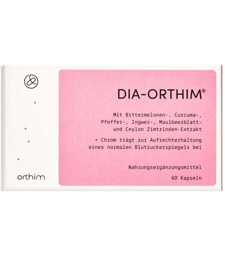 Nahrungsergänzungsmittel sind kein Ersatz für eine ausgewogene und abwechslungsreiche Ernährung und eine gesunde Lebensweise. NAHRUNGSERGÄNZUNG – Kapsel mit Bittermelonen-, Curcuma-, Pfeffer-, Ingwer-, Maulbeerblatt-, und Ceylon Zimtrindenextrakt, Chrom, Vitamin D3, B1, B6, Biotin und Zink FUNKTION – für einen gesunden Blutzuckerspiegel – Chrom trägt zur Aufrechterhaltung eines normalen Blutzuckerspiegels bei EIGENSCHAFTEN – die Kapsel ist vegan, lactose- und glutenfrei ANWENDUNG – 2 x täglich 1 Kapsel mit ausreichend Flüssigkeit zu einer Mahlzeit einnehmen. QUALITÄT – natürliche Vitalstoffe Made in Germany Unser Körper und vor allem unser Gehirn benötigen Energie in Form von Zucker (Kohlenhydrate), den wir über unsere Nahrung zu uns nehmen. Damit die großen Zuckermoleküle auch in unsere Zellen gelangen können, sind u.a. eine Reihe von Enzymen sowie ein Hormon notwendig. Dieses Hormon, das in der Bauchspeicheldrüse gebildet wird, ist zwingend notwendig dafür, dass der Zucker, der sich nach einer Mahlzeit oder einem Snack im Blut befindet, auch in die Zelle gelangen kann. Ist dieser Kreislauf gestört, bleibt der Zuckerspiegel hoch, die Zellen jedoch erhalten keine Energie. Ein hoher Blutzuckerspiegel ist über einen längeren Zeitraum hinweg schädlich für Zellen, denn der freie Zucker im Blut führt zu Veränderungen von kleinen und großen Blutgefäßen und kann Nervenschäden verursachen. Deshalb ist ein gesunder Blutzuckerspiegel so wichtig. DIA-ORTHIM® mit Chrom (III) ist in der Lage, zur Aufrechterhaltung eines normalen Blutzuckerspiegels beizutragen. Es enthält eine einzigartige Kombination aus Pflanzenextrakten wie Bittermelone-, Curcuma-, Pfeffer-, Ingwer-, Maulbeerblatt-, und Ceylon Zimtrinden-Extrakt + Vitamin B1, Vitamin B6, Vitamin D3, Chrom, Biotin und Zink. DIA-ORTHIM® ist eine ideal zusammengesetzte und dosierte Kombination von Inhaltsstoffen speziell für Menschen, die auf ihren Blutzuckerspiegel achten müssen.ZutatenBittermelonen-Extrakt (45,49 %); Kapselhüllsubstanz: Hydroxypropylmethylcellulose; Curcuma-Extrakt (11,38 %); Ceylon Zimtrinden-Extrakt (11,38 %); Maulbeerblatt-Extrakt (11,38 %); Füllstoff: Calciumcarbonat; Füllstoff: Cellulose, mikrokristallin; Ingwer-Extrakt (4,55 %); Zinkoxid; Pfeffer-Extrakt (0,46 %); Vitamin B6 (Pyridoxinhydrochlorid); Vitamin B1 (Thiaminmononitrat); Chrom (III)-chlorid; D-Biotin; Vitamin D3 (Cholecalciferol), veganNährwerte: Durchschnittliche Nährwerte: pro Kapsel pro 2 Kapseln NRV* Chrom 50 µg 100 µg 250 Vitamin D3 13 µg 26 µg 520 Vitamin B1 1,42 mg 2,84 mg 260 Vitamin B6 1,82 mg 3,64 mg 260 Biotin 12 µg 24 µg 24 Zink 10 mg 20 mg 200 Bittermelonen-Extrakt enthält Saponine 200 mg 20 mg 400 mg 40 mg ** Curcuma-Extrakt enthält Curcuminoide 50 mg 47,5 mg 100 mg 95 mg ** Pfeffer-Extrakt 2 mg 4 mg ** Ceylon Zimtrinden-Extrakt 50 mg 100 mg ** Ingwer-Extrakt enthält Gingerol 20 mg 1 mg 40 mg 2 mg ** Maulbeerblatt-Extrakt enthält 1-Deoxynojirimycin (DNJ) 50 mg 0,5 mg 100 mg 1 mg ** * Prozentsatz des... ...