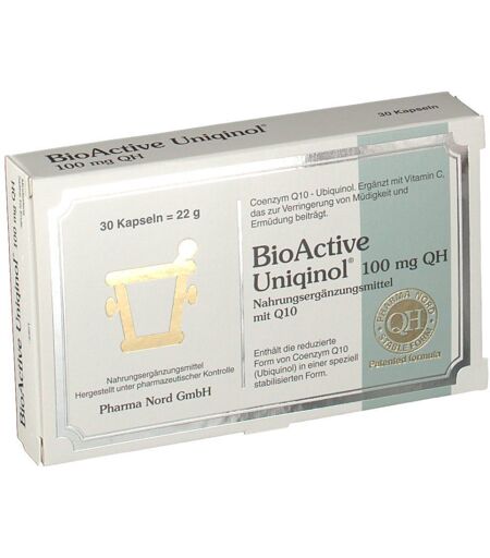 Nahrungsergänzungsmittel sind kein Ersatz für eine ausgewogene und abwechslungsreiche Ernährung und eine gesunde Lebensweise.Was ist BioActive Uniqinol 100 mg QH? BioActive Uniqinol sind lichtgeschützte Kapseln aus weicher Gelatine, die das Coenzym Q10 in seiner reduzierten Form als Ubiquinol in Kokosöl enthalten. Jede Kapsel enthält 100 mg Ubiquinol.Nahrungsergänzungsmittel mit Ubiquinol haben einen Nachteil, nämlich dass das Ubiquinol bei Kontakt mit Sauerstoff oxidiert und dadurch in seine ursprüngliche Form, in das Ubiquinon zurückkehrt. Mit einem speziellen Herstellungsverfahren ist es Pharma Nord jedoch gelungen, den Grundstoff so einzukapseln, dass er seine reduzierte Form behält.Das zum Patent angemeldeten Weichgelatinekapseln schützen das BioActive Uniqinol vor Licht und Oxidation und geben die Wirkstoffe in der gewünschten Form in Ihrem Körper ab. Was ist Coenzym Q10?Das Coenzym Q10 oder einfach Q10 ist eine fettlösliche, vitaminähnliche Substanz, die in zwei Formen auftritt: Ubiquinon und Ubiquinol (vom Lateinischen ubique, was „überall“ bedeutet).Benötigt eine Zelle Energie, wandelt sie Fett, Kohlenhydrate und Proteine in das Molekül ATP (Adenosintriphosphat) um, das Energie in seiner chemischen Form speichert. Die Zelle spaltet nun das ATP-Molekül und gibt die darin gespeicherte Energie frei. Der gesamte Prozess findet in den Zellen in kleinen, bohnenförmigen Strukturen, den sogenannten Mitochondrien, statt. Q10 kommt in allen Mitochondrien vor. Besonders Muskelzellen haben einen hohen Energiebedarf. Daher enthalten Muskelzellen wesentlich mehr Mitochondrien als andere Zelltypen. Der Herzmuskel ist ein gutes Beispiel für ein Körpergewebe, in dem die Zellen viele Mitochondrien enthalten, und der Energiebedarf daher entsprechend groß ist.Gute Q10-QuellenQ10 kommt in verschiedenen Nahrungsmitteln vor. In unserer Ernährung kommt sowohl Ubiquinon als auch Ubiquinol zu gleichen Teilen vor. Besonders reich an Q10 sind etwa: Rindfleisch Schweinefleisch Hering Sojaöl Sardinen Für wen ist aktives Q10 am besten geeignet? Personen über 50 Jahre Personen mit einem niedrigen Q10-Level im Körper Personen, die ihren Q10-Level im Blut mit herkömmlichem Q10 nicht ausreichend hoch halten können Enthält die reduzierte Form von Q10 geläufig unter dem Namen Ubiqinol – bekannt als eine von Natur aus sehr instabile Form von Q10 Dokumentierte Bioverfügbarkeit und Qualität Entwickelt durch ein spezielles Herstellungsverfahren und in eigens-produzierten Weichgelatine-Kapseln eingebettet, um vor Licht und Oxidation zu schützen Hergestellt unter pharmazeutischer Kontrolle und durch die Dänische Arzneimittelbehörde inspiziert Zutaten: Kokosfett, Speisegelatine, Coenzym Q10, Feuchthaltemittel: Glycerin, Farbstoff: Ammoniak-Zuckercouleur, Wasser, Vitamin C, Antioxidationsmittel: Ascorbinsäure, Trennmittel: Siliciumdioxid, Antioxidationsmittel: stark tocopherolhaltige Extrakte.Nährwerte: Durchschnittliche Nährwerte pro Kapsel % NRV* Ubiquinol (Coenzym... ...