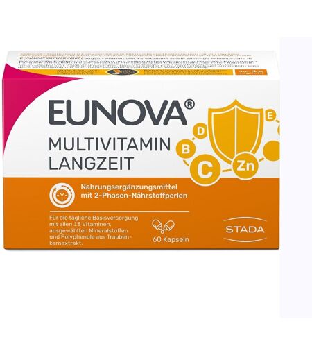 Nahrungsergänzungsmittel sind kein Ersatz für eine ausgewogene und abwechslungsreiche Ernährung und eine gesunde Lebensweise.EUNOVA® LANGZEIT - EINFACH GUT VERSORGT MIT EUNOVA®Vitamine und Mineralstoffe sind organische Verbindungen, die an wichtigen Stoffwechselprozessen beteiligt sind. Man unterscheidet wasserlösliche und fettlösliche Vitamine. Insgesamt gibt es 13 verschiedene Vitamine, die im Körper unterschiedliche Funktionen erfüllen. Unser Körper kann Vitamine gar nicht oder nur in geringen Mengen selbst herstellen. Deshalb ist es notwendig, Vitamine regelmäßig über die Ernährung zuzuführen. Eine Ausnahme bildet Vitamin D, das der menschliche Körper selbst bilden kann, abhängig vom Alter, der Intensität der Sonnenstrahlen und wie lange man sich draußen aufhält.Auch Mineralstoffe sind an wichtigen Körperfunktionen beteiligt und daher essenziell. Zu den Mineralstoffen gehören die sogenannten Mengenelemente, die für den Menschen wichtig sind und in der Regel in Mengen von > 50 mg/kg im menschlichen Körper vorkommen, sowie die Spurenelemente, die in geringeren Mengen benötigt werden. Auch Mineralstoffe müssen regelmäßig über die Ernährung aufgenommen werden, weshalb eine ausgewogene und abwechslungsreiche Ernährung sowie eine gesunde Lebensweise wichtig sind.EUNOVA® Langzeit hilft den täglichen Bedarf an wertvollen Nährstoffen zu decken.PRODUKTPROFILEUNOVA® Langzeit enthält alle 13 Vitamine sowie wichtige Mineralstoffe und Spurenelemente in einem ausgewogenen Verhältnis. Die einzigartige Langzeittechnologie verbessert die Aufnahme von Nährstoffen durch eine spezielle Kombination von schnell und langsam freigesetzten Perlen. Fast alle wasserlöslichen Vitamine werden über mehrere Stunden nach und nach freigesetzt. Lediglich bei Vitamin B12 und Folsäure wurde bewusst auf eine zeitverzögerte Freisetzung verzichtet, um eine optimale Aufnahme zu gewährleisten.VERZEHRSEMPFEHLUNGTäglich 1 Kapsel nach dem Frühstück mit ausreichend Flüssigkeit schlucken.ie angegebene empfohlene tägliche Verzehrmenge darf nicht überschritten werden. Nahrungsergänzungsmittel sollten nicht als Ersatz für eine abwechslungsreiche und ausgewogene Ernährung sowie eine gesunde Lebensweise verwendet werden. Schwangere Frauen sollten aufgrund des Vitamin A-Gehaltes vor Beginn des Verzehrs ihren Arzt befragen. Personen, die Blutverdünnungsmittel (Antikoagulantien vom Cumarin-Typ) einnehmen, sollten aufgrund des Vitamin K Gehaltes vor Beginn des Verzehrs ihren Arzt befragen. HÄUFIGE FRAGEN & ANTWORTENWelche Vitamine enthält EUNOVA® Langzeit? EUNOVA® Langzeit enthält alle 13 Vitamine: A, D, E, K, C, B1, B2, B3, B6, B9, B12, B7 und B5. Welche Mineralstoffe enthält EUNOVA® Langzeit? EUNOVA® Langzeit enthält Zink, Mangan, Selen, Chrom und Molybdän. Zink trägt zu der Erhaltung normaler Haut, Haare und Nägel bei. Außerdem ist es an einer normalen Funktion des Immunsystems beteiligt. Mangan trägt dazu bei, die Zellen vor oxidativem Stress zu schützen und wirkt an der Erhaltung... ...