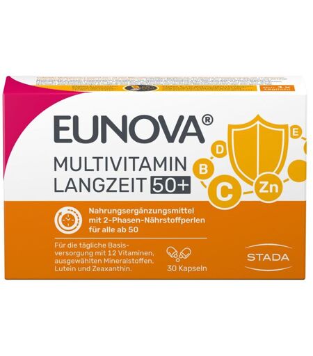 Nahrungsergänzungsmittel sind kein Ersatz für eine ausgewogene und abwechslungsreiche Ernährung und eine gesunde Lebensweise. EUNOVA® LANGZEIT 50+ - EINFACH GUT VERSORGT MIT EUNOVA®Vitamine und Mineralstoffe sind organische Verbindungen, die an wichtigen Stoffwechselprozessen beteiligt sind. Man unterscheidet wasserlösliche und fettlösliche Vitamine. Insgesamt gibt es 13 verschiedene Vitamine, die im Körper unterschiedliche Funktionen erfüllen. Unser Körper kann Vitamine gar nicht oder nur in geringen Mengen selbst herstellen. Deshalb ist es notwendig, Vitamine regelmäßig über die Ernährung zuzuführen. Eine Ausnahme bildet Vitamin D, das der menschliche Körper selbst bilden kann, abhängig vom Alter, der Intensität der Sonnenstrahlen und wie lange man sich draußen aufhält. Auch Mineralstoffe sind an wichtigen Körperfunktionen beteiligt und daher essenziell. Zu den Mineralstoffen gehören die sogenannten Mengenelemente, die für den Menschen wichtig sind und in der Regel in Mengen von > 50 mg/kg im menschlichen Körper vorkommen, sowie die Spurenelemente, die in geringeren Mengen benötigt werden. Auch Mineralstoffe müssen regelmäßig über die Ernährung aufgenommen werden, weshalb eine ausgewogene und abwechslungsreiche Ernährung sowie eine gesunde Lebensweise wichtig sind.EUNOVA® Langzeit 50+ hilft Menschen ab einem Alter von 50 Jahren ihren täglichen Bedarf an wertvollen Nährstoffen zu decken. PRODUKTPROFILEUNOVA® Langzeit 50+ ist speziell auf den Nährstoffbedarf von Menschen ab 50 Jahren abgestimmt und enthält 13 Vitamine, wichtige Mineralstoffe und Spurenelemente in einem ausgewogenen Verhältnis EUNOVA® Langzeit 50+ verfügt neben der Nährstoffperlen-Technologie auch über ein Plus an pflanzlichen Antioxidantien. So wurden die Carotinoide Lutein und Lycopin und pflanzliches Vitamin E mindestens doppelt so hoch dosiert wie in EUNOVA® Langzeit. Die einzigartige Langzeit-Technologie verbessert die Aufnahme von Nährstoffen durch eine spezielle Kombination von schnell und langsam freigesetzten Perlen. Fast alle wasserlöslichen Vitamine werden über mehrere Stunden nach und nach freigesetzt. Lediglich bei Vitamin B12 und Folsäure wurde bewusst auf eine zeitverzögerte Freisetzung verzichtet, um eine optimale Aufnahme zu gewährleisten.VERZEHRSEMPFEHLUNG Täglich 1 Kapsel nach dem Frühstück mit ausreichend Flüssigkeit schlucken. Die angegebene empfohlene tägliche Verzehrmenge darf nicht überschritten werden. Nahrungsergänzungsmittel sollten nicht als Ersatz für eine abwechslungsreiche und ausgewogene Ernährung sowie eine gesunde Lebensweise verwendet werden. Schwangere Frauen sollten aufgrund des Vitamin A-Gehaltes vor Beginn des Verzehrs ihren Arzt befragen. Außerhalb der Reichweite kleiner Kinder aufbewahren.HÄUFIGE FRAGEN & ANTWORTENWelche Vitamine enthält EUNOVA® Langzeit 50+? EUNOVA® Langzeit 50+ enthält 12 Vitamine: A, D, E, C, B1, B2, B3, B6, B9, B12, B7 und B5. Welche Mineralstoffe enthält EUNOVA® Langzeit 50+? EUNOVA® Langzeit 50+ enthält Zink,... ...