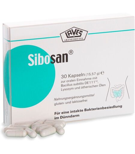 Nahrungsergänzungsmittel sind kein Ersatz für eine ausgewogene und abwechslungsreiche Ernährung und eine gesunde Lebensweise. dem probiotischen Bakterienstamm Bacillus subtilis-DE111TM, Lysozm und ätherischen Ölen für die milde Regulation der Darmflora. Durch die praktische Kapselform werden die probiotischen Bakterien vor der Magensäure geschützt und erreichen so ihren Wirkort – den Darm. Da auch die Kapselhülle aus keinerlei tierischen Stoffen besteht, ist Sibosan® auch für Vegetarier geeignetSibosan® ist eine besondere Kombination ausprobiotischen Bakterien Bacillus subtilis DE111TM in hoher Konzentration 1 x 10? KBE/Kapsel (2,5 mg) Lysozym ätherischen Ölen Zutaten:Tapiokadextrin, Lysozym (Ei), vegetarische Kapselhülle (Hydroxypropylmethylcellulose,Wasser), Stabilisator Kaliumgluconat, Maltodextrin, modifi zierte Stärke, ätherische Öle(Eugenol, Carvacrol, Thymol) (enthält Schwefeldioxid/Sulfi te), mittelkettige Triglyceride,Bacillus subtilis DE111™.Nährwerte: Durchschnittliche Nährwerte: Pro Kapsel Pro 2 Kapseln Pro 3 Kapseln Bacillus subtilis 2,5 mg 5 mg 7,5 mg Lysozym 110 mg 220 mg 330 mg Ätherische Öle: -Eugenol -Carvacrol - Thymol 35 mg 70 mg 105 mg Verzehrempfehlung:Je eine Kapsel 1-3 x tgl. mit etwas Flüssigkeit zu einer größeren Mahlzeit einnehmen.Hinweis:Die angegebene Tagesverzehrmenge darf nicht überschritten werden.Aufbewahrung:Kühl (6-25 °C) und lichtgeschützt lagern. Nach dem Öffnen innerhalb von 3 Monaten aufbrauchen.Nettofüllmenge:30 Kapseln = 15,57 gHersteller:Laves-Arzneimittel GmbHBarbarastr. 14D-30952 RonnenbergDeutschland ...