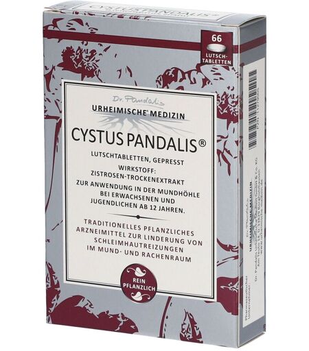 Traditionelles pflanzliches Arzneimittelgluten- und lactosefreiveganZusammensetzungEine Lutschtablette, gepresst, enthält:Wirkstoff: 76,8 mg Trockenextrakt aus Zistrosenkraut (4-9:1, Auszugsmittel: Wasser),Sonstige Bestandteile: Sprühgetrockneter Glucose-Sirup, Bananenpulver, Roterübenpulver (E 162), Hagebuttenkernöl.AnwendungsgebieteCystus Pandalis® ist ein traditionelles pflanzliches Arzneimittel zur Linderung von Schleimhautreizungen im Mund- und Rachenraum.Diese Angabe beruht ausschließlich auf Grund langjähriger Anwendung.Bei fortdauernden Krankheitssymptomen oder bei Auftreten von Nebenwirkungen sollte ein Arzt oder eine andere in einem Heilberuf tätige qualifizierte Person aufgesucht werden.Dosierungsanleitung, Art und Dauer der AnwendungDie übliche Dosis ist: Erwachsene, Jugendliche und Kinder ab 12 Jahren lassen alle 3 Stunden 1-2 Lutschtabletten langsam im Mund zergehen.GegenanzeigenCystus Pandalis® darf nicht eingenommen / angewendet werden: wenn Sie überempfindlich (allergisch) gegen Zistrosenkraut (Cistus incanus), andere Pflanzen der Familie der Zistrosengewächse (Cistaceae) oder einen der sonstigen Bestandteile von Cystus Pandalis® sind.NebenwirkungenWie alle Arzneimittel kann Cystus Pandalis® Nebenwirkungen haben, die aber nicht bei jedem auftreten müssen.Bei empfindlichen Patienten können Überempfindlichkeitsreaktionen / allergische Reaktionen auftreten.Es können Magenschmerzen und Übelkeit auftreten.Die Häufigkeit ist nicht bekannt.Bei den ersten Anzeichen einer Überempfindlichkeitsreaktion darf Cystus Pandalis® nicht nochmals eingenommen werden.Gegebenenfalls ist ein Arzt aufzusuchen.Vorsichtsmaßnahmen für die Anwendung und WarnhinweiseBei Einnahme/Anwendung von Cystus Pandalis® mit anderen Arzneimitteln: Es sind keine Wechselwirkungen von Cystus Pandalis® mit anderen Arzneimitteln bekannt.Aus Vorsichtsgründen wird die gleichzeitige Anwendung von Arzneimitteln, die in der Mundhöhle angewendet werden und im ganzen Organismus (systemisch) wirken sollen, nicht empfohlen.Cystus Pandalis® sollte wie alle gerbstoffreichen Arzneimittel 1 Stunde versetzt zu anderen Arzneimitteln eingenommen werden.Schwangerschaft und StillzeitDie Sicherheit während der Schwangerschaft und Stillzeit wurde nicht ausreichend untersucht.KinderEs liegen keine Daten zur Anwendung bei Kindern unter 12 Jahren vor.Die Anwendung bei Kindern unter 12 Jahren wird deshalb nicht empfohlen. ...