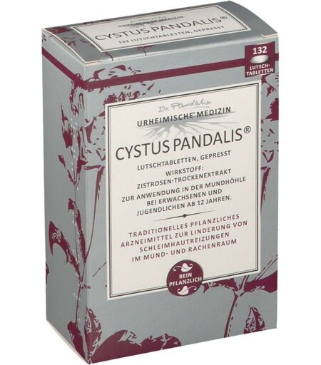 AnwendungsgebieteCystus Pandalis® ist ein traditionelles pflanzliches Arzneimittel zur Linderung von Schleimhautreizungen im Mund- und Rachenraum.Diese Angabe beruht ausschließlich auf Grund langjähriger Anwendung.Bei fortdauernden Krankheitssymptomen oder bei Auftreten von Nebenwirkungen sollte ein Arzt oder eine andere in einem Heilberuf tätige qualifizierte Person aufgesucht werden.ZusammensetzungEine Lutschtablette, gepresst, enthält:Wirkstoff: 76,8 mg Trockenextrakt aus Zistrosenkraut (4-9:1, Auszugsmittel: Wasser),Sonstige Bestandteile: Sprühgetrockneter Glucose-Sirup, Bananenpulver, Roterübenpulver (E 162), Hagebuttenkernöl.Dosierungsanleitung, Art und Dauer der AnwendungDie übliche Dosis ist: Erwachsene, Jugendliche und Kinder ab 12 Jahren lassen alle 3 Stunden 1-2 Lutschtabletten langsam im Mund zergehen.SonstigesGegenanzeigenCystus Pandalis® darf nicht eingenommen / angewendet werden: wenn Sie überempfindlich (allergisch) gegen Zistrosenkraut (Cistus incanus), andere Pflanzen der Familie der Zistrosengewächse (Cistaceae) oder einen der sonstigen Bestandteile von Cystus Pandalis® sind.NebenwirkungenWie alle Arzneimittel kann Cystus Pandalis® Nebenwirkungen haben, die aber nicht bei jedem auftreten müssen.Bei empfindlichen Patienten können Überempfindlichkeitsreaktionen / allergische Reaktionen auftreten.Es können Magenschmerzen und Übelkeit auftreten. Die Häufigkeit ist nicht bekannt.Bei den ersten Anzeichen einer Überempfindlichkeitsreaktion darf Cystus Pandalis® nicht nochmals eingenommen werden.Gegebenenfalls ist ein Arzt aufzusuchen.Vorsichtsmaßnahmen für die Anwendung und WarnhinweiseBei Einnahme/Anwendung von Cystus Pandalis® mit anderen Arzneimitteln: Es sind keine Wechselwirkungen von Cystus Pandalis® mit anderen Arzneimitteln bekannt.Aus Vorsichtsgründen wird die gleichzeitige Anwendung von Arzneimitteln, die in der Mundhöhle angewendet werden und im ganzen Organismus (systemisch) wirken sollen, nicht empfohlen.Cystus Pandalis® sollte wie alle gerbstoffreichen Arzneimittel 1 Stunde versetzt zu anderen Arzneimitteln eingenommen werden.Schwangerschaft und StillzeitDie Sicherheit während der Schwangerschaft und Stillzeit wurde nicht ausreichend untersucht.KinderEs liegen keine Daten zur Anwendung bei Kindern unter 12 Jahren vor.Die Anwendung bei Kindern unter 12 Jahren wird deshalb nicht empfohlen. ...