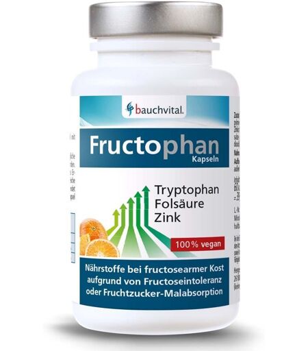 Nahrungsergänzungsmittel sind kein Ersatz für eine ausgewogene und abwechslungsreiche Ernährung und eine gesunde Lebensweise. Nahrungsergänzungsmittel mit Tryptophan, Folsäure und Zink zur Ergänzung eines erhöhten Bedarfs bei Fructose-Intoleranz und Fruchtzucker-Malabsorption. Wozu dient Fructophan?Menschen mit Fruchtzucker-Malabsorption und Fructose-Intoleranz leiden signifikant gehäuft unter erniedrigtem Tryptophan-, Folsäure- und Zink-Spiegel. Depressive Verstimmungen, Schlafstörungen, Heißhunger, Konzentrationsstörungen, häufige Infektionskrankheiten, brüchiges Haar und Nägel sowie weitere Folgeerkrankungen können auftreten. Fructophan ergänzt einen Bedarf an Tryptophan, Zink und Folsäure bei Fruchtzucker-Malabsorption und hereditärer Fructose-Intoleranz täglich auf bequeme Art. Zutaten: L-Tryptophan, Überzugsmittel: Hydroxypropylmethylcellulose, mittelkettige Triglyceride Pulver, Zinkcarbonat, Trennmittel: Talkum, Pteroylmonoglutaminsäure. Nährwerte Pro Kapsel % RM* L-Tryptophan 500,00 mg - Zink 10,00 mg 100 % Folsäure 200,00 mg 100 % *RM = Referenzmenge entspr. Tagesbedarf eines durchschnittlichen Erwachsenen. Verzehrsempfehlung: 1-mal täglich eine Kapsel unzerkaut mit ausreichend Flüssigkeit zu den Mahlzeiten einnehmen. Eine langfristige Verwendung von Fructophan wird empfohlen. Hinweis: Die täglich empfohlene Verzehrmenge darf nicht überschritten werden. Die Steckkapseln können leicht geöffnet und bei Bedarf niedriger portioniert werden. Zur Höhe der individuellen Portionierung bei Kindern unterschiedlichen Alters befragen Sie bitte Ihren Arzt oder Apotheker. Lagerungshinweis: Außerhalb der Reichweite von kleinen Kindern aufbewahren. Kühl, trocken und lichtgeschützt aufbewahren. Nettofüllmenge:60 Kapseln = 41,4 g Herstellerdaten: Laktonova GmbHBienenweg 2326188 Edewecht-Friedrichsfehn ...