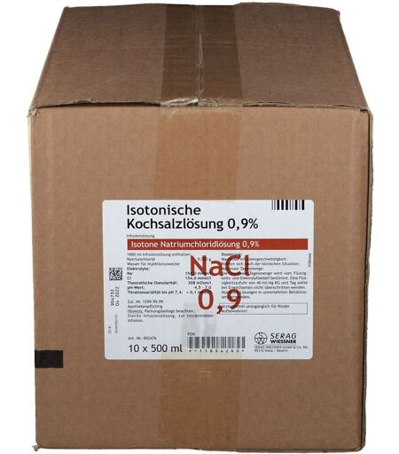 Was ist Isotonische Kochsalzlösung 0,9% und wofür wird sie angewendet? Stoff- oder Indikationsgruppe Elektrolytlösung Na+: 0,154 mmol / ml bzw. 154 mmol / l Cl-: 0,154 mmol / ml bzw. 154 mmol / l Anwendungsgebiete Flüssigkeits- und Elektrolytsubstitution bei hypochlorämischer Alkalose Chloridverluste kurzfristiger intravasaler Volumenersatz hypotone Dehydratation isotone Dehydratation Wie ist Isotonische Kochsalzlösung 0,9% anzuwenden? Dosierungsanleitung Die Dosierung richtet sich in der Regel nach dem Flüssigkeits- und Elektrolytbedarf (40 ml / kg KG / Tag bzw. 2 mmol Natrium / kg KG / Tag). Es gelten folgende Richtwerte: Maximale Infusionsgeschwindigkeit: Richtet sich nach der klinischen Situation. Maximale Tagesdosis: Die maximale Tagesdosis wird vom Flüssigkeits- und Elektrolytbedarf bestimmt. Für Erwachsene gilt ein Wert von 3-6 mmol Natrium/ kg KG, für Kinder von 3-5 mmol Natrium / kg KG. Bei hypertoner Dehydratation ist eine zu schnelle Infusionsgeschwindigkeit unbedingt zu vermeiden (Cave: Anstieg der Plasma-Osmolarität und der Plasma- Natriumkonzentration). Art der Anwendung Zur intravenösen Infusion. Überdosierung Die Symptome einer Überdosierung sind: Überwässerung erhöhter Natrium- und Chloridgehalt des Blutes (Hypernatriämie, Hyperchlorämie) Hyperosmolarität Induktion einer azidotischen Stoffwechsellage Therapie: Unterbrechung der Zufuhr der Lösung, beschleunigte Elimination über die Nieren und eine verringerte Zufuhr der entsprechenden Elektrolyte. Bei Fragen zur Anwendung des Arzneimittels ist der Arzt oder Apotheker zu befragen. Weitere Informationen Zusammensetzung 1000 ml Infusionslösung enthalten: Wirkstoff: Natriumchlorid 9,000 g Sonstige Bestandteile: Wasser für Injektionszwecke Theor. Osmolarität: 308 mOsm/l pH-Wert: ...
