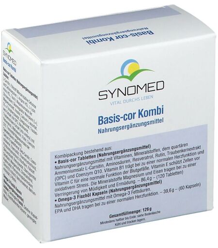 Nahrungsergänzungsmittel sind kein Ersatz für eine ausgewogene, abwechslungsreiche Ernährung und eine gesunde Lebensweise. Nahrungsergänzungsmittel mit Vitaminen, Mineralstoffen, dem quartären Ammoniumsalz L-Carnitin, Aminosäuren, Resveratrol, Rutin, Traubenkern-Extrakt (OPC) und Coenzym Q10. Vitamin B1 trägt bei zu einer normalen Herzfunktion und Vitamin C für eine normale Funktion der Blutgefäße. Vitamin E schützt Zellen vor oxidativem Stress. Die Mineralstoffe Magnesium und Eisen tragen bei zu einer Verringerung von Müdigkeit und Ermüdung. Die Omega-3 Fettsäuren EPA und DHA tragen bei zu einer normalen Herzfunktion. Zutaten:Zutaten Basis-cor Tabletten: L-Carnitin, Füllstoff Mikrokristalline Cellulose und Cellulosepulver, L-Arginin HCL, Taurin, Magnesiumsalze der Zitronensäure, Säureregulator Weinsäure (L+), Magnesiumoxid, Inositol, Calcium-L-ascorbat, DL-α-Tocopherylacetat, Zinkgluconat, Traubenkern-Extrakt (mit OPC), Nicotinamid, Traubenschalen-Extrakt [Vitis vinifera] (mit Resveratrol), Maltodextrin, Rutin, Coenzym Q10, Trennmittel Magnesiumsalze der Speisefettsäuren (pflanzlich), Calcium-D-pantothenat, Beta-Carotin, Cyanocobalamin, Eisensulfat, Thiaminhydrochlorid, Pyridoxinhydrochlorid, Riboflavin, Füllstoff Siliciumdioxid, Retinylacetat, Überzugsmittel Schellack, Mangansulfat, Cholecalciferol, Kupfersulfat, Pteroylmonoglutaminsäure, Chrom(III)-chlorid, Natriumselenat, Natriummolybdat, D-Biotin. Zutaten Omega-3 Fischöl: Gereinigtes Fischöl, Gelatine (Kapselhülle),Feuchthaltemittel Glycerin, gereinigtes Wasser. Nährwerte: zusammensetzung pro Kapsel % NRV Vitamin C80 mg(100%*)OPC60 mg (aus Traubenkern-Extrakt)63,2 mg Vitamin E30 mg (α-TE)(250%*)Niacin (Vit. B3)50 mg (NE)(313%*)Coenzym Q1030 mg Pantothensäure18 mg(300%*)Rutin30 mg Resveratrol5 mg (aus Traubenschalen-Extrakt100 mg) Thiamin (Vitamin B1)5 mg(455%*)Riboflavin (Vitamin B2)5 mg(357%*)Vitamin B65 mg(357%*)Folsäure600 µg (300%*)Biotin100 µg(200%*)Vitamin A833 µg (RE)(104%*)Vitamin B129 µg(360%*)Vitamin D35 µg(100%*)Magnesium87 mg(23%*)L-Carnitin400 mg L-Lysin250 mg Taurin250 mg Inositol100 mg L-Arginin250 mg Eisen2,4 mg(17%*)Zink10 mg(100%*)Mangan0,6 mg(30%*)Kupfer400 µg(40%*)Molybdän60 µg(120%*)Selen55 µg(100%*)Chrom50 µg(125%*) *Referenzmenge nach LMIV (NRV Verzehrsempfehlung:Täglich morgens und abends jeweils 2 Basis-cor Tabletten sowie jeweils 1 Kapsel Omega-3 Fischöl (unzerkaut) zu oder nach einer Mahlzeit mit ausreichend Flüssigkeit verzehren. Hinweis:Die angegebene empfohlene tägliche Verzehrsmenge darf nicht überschritten werden. Lagerung:Bitte außerhalb der Reichweite von kleinen Kindern aufbewahren. Nettofüllmenge:Basis-cor Tabletten 120 Tabletten (Monatspackung)Omega-3 Fischölkapseln 60 Stück (Monatspackung) Hersteller:Synomed GmbHFlamweg 132 - 13425335 Elmshorn ...