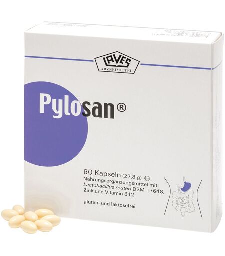 Bitte achten Sie auf eine ausgewogene und abwechslungsreiche Ernährung und eine gesunde Lebensweise. Pylosan® Lebensmittel für besondere medizinische Zwecke (bilanzierte Diät) zum Diätmanagement bei Helicobacter pylori-assoziierter Gastritis Pylosan® ist eine besondere Kombination aus inaktivierten Bakterien des Lactobacillus reuteri DSM 17648 in hoher Konzentration (1010 Bakterien), Zink und Vitamin B12 und dient dem Diätmanagement bei H. pylori-assoziierter Gastritis. Mit Pylosan® können die Wirksamkeit und die Verträglichkeit der gängigen H. pylori-Therapien (Eradikationstherapien, vollständige Abtötung von H. pylori) verbessert und Symptome der Gastritis gemindert werden. Zutaten: Sonnenblumenöl, Gelatine (Rind), Lactobacillus reuteri DSM 17648 (inaktiviert), Feuchthaltemittel Glycerin, Emulgator Lecithine, pflanzliches Öl (Palmöl), Emulgator Mono- und Diglyceride von Speisefettsäuren, Zinkoxid, Farbstoff Eisenoxid gelb, Cyanocobalamin (Vitamin B12). Nährwerte: Durchschnittliche Nährwerte: pro 100 g: pro Tagesportion (2 Kapseln) Energie 2096 kJ / 504 kcal 19 kJ / 5 kcal Fett - davon gesättigte Fettsäuren 38,8 g 8,9 g 0,4 g 0,1 g Kohlenhydrate - davon Zucker 19,4 g 0,1 g 0,2 g 0,1 g Eiweiß 24,1 g 0,2 g Salz 14,4 g 0,1 g Lactobacillus reuteri DSM 17648 2,17 x 1012 2 x 1010 Zink 1084 mg 10 mg Vitamin B12 271 µg 2,5 µg Verzehrempfehlung: 2-mal täglich 1 Kapsel nach dem Frühstück und Abendessen mit etwas Flüssigkeit einnehmen (unzerkaut schlucken). Hinweis: Die angegebene Tagesverzehrmenge darf nicht überschritten werden. Aufbewahrung: Kühl (6-25 °C) und lichtgeschützt lagern. Nach dem Öffnen innerhalb von 3 Monaten aufbrauchen. Nettofüllmenge: 60 Kapseln = 27,7 g Hersteller: Laves-Arzneimittel GmbH Barbarastr. 14 D-30952 Ronnenberg ...