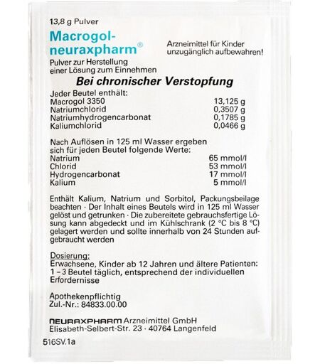 Was ist Macrogol-neuraxpharm undwofür wird es angewendet? Macrogol-neuraxpharm ist ein Abführmittelzur Behandlung von chronischer Verstopfung. Macrogol 3350 macht Ihren Stuhl weicher und ermöglicht eine leichtere Passage,wodurch Sie von der Verstopfung befreitwerden. Die Elektrolyte (Salze) helfen,die normalen Spiegel von körpereigenem Natrium, Kalium und Wasser beizubehalten,während Ihre Verstopfung behandelt wird. Wenn Sie sich nach 14 Tagen nicht besseroder gar schlechter fühlen, wenden Sie sich an Ihren Arzt. Wie ist Macrogol-neuraxpharm einzunehmen? Nehmen Sie dieses Arzneimittel immergenau wie in dieser Packungsbeilagebeschrieben bzw. genau nach der mit Ihrem Arzt oder Apotheker getroffenen Absprache ein. Fragen Sie bei Ihrem Arztoder Apotheker nach, wenn Sie sich nichtsicher sind. Dieses Arzneimittel kann jederzeit und unabhängig von einer Mahlzeit eingenommenwerden. Die Einnahme der zubereiteten Lösung von Macrogol-neuraxpharm ersetztnicht die reguläre Flüssigkeitszufuhr. Diese muss weiterhin gewährleistet sein.Die empfohlene Dosis für Erwachsene,Kinder (ab 12 Jahren) und ältere Patientenbeträgt: In Abhängigkeit der Schwere der Verstopfung 1- bis 3-mal täglich 1 Beutel.Herstellen der Lösung: Öffnen Sie den Beutel und geben Sie den Inhalt in ein Glas. Fügen Sie ca. 125 ml oderein halbes Glas Wasser hinzu. Rühren Sie so lange, bis sich das Pulver vollständig aufgelöst hat und die Lösung klar oder leicht trübist. Trinken Sie anschließend die Lösung. Dauer der Anwendung: Die Behandlung mit Macrogol-neuraxpharm dauert üblicherweise etwa 2 Wochen. Wenn Sie Macrogol-neuraxpharm über einen längeren Zeitraum einnehmen müssen, sprechen Sie bitte mitIhrem Arzt. Wenn Ihre Verstopfung voneiner Krankheit wie z. B. Parkinson oder Mulstiple Sklerose (MS) verursacht wird oder wenn Sie Arzneimittel einnehmen, die Verstopfung verursachen, kann Ihr Arzt empfehlen, Macrogol-neuraxpharm länger als 2 Wochen einzunehmen. Für die Langzeitbehandlung kann die Dosis gewöhnlich auf 1 oder 2 Beutel pro Tag reduziert werden. Wenn Sie eine größere Menge von Macrogol-neuraxpharm eingenommen haben, als Sie sollten Dies könnte zu starken Schmerzen und Aufblähungen im Bauchraum (Magen), Erbrechen (Übelkeit) oder Durchfall führen. Stoppen Sie in diesem Fall die Einnahme von Macrogol-neuraxpharm, bis die Beschwerden verschwinden, und beginnen Sie mit der Einnahme erneut mit einer geringeren Dosis. Wenn Sie sich nicht sicher sind, fragen Sie Ihren Arzt oder Apotheker. Wenn Sie die Einnahme von Macrogol-neuraxpharm vergessen haben Wenn Sie die Einnahme vergessen haben, nehmen Sie die Dosis ein, sobald Sie sich daran erinnern. Setzen Sie die Anwendung mit der vorgesehenen Dosierung fort. Nehmen Sie nicht die doppelte Menge ein, wenn Sie die vorherige Einnahme vergessen haben. Wenn Sie die Einnahme von Macrogol-neuraxpharm abbrechen Um den größten Nutzen von Macrogol-neuraxpharm zu erzielen, nehmen Sie das Arzneimittel immer gemäß der Packungsbeilage ein. Dadurch wird... ...