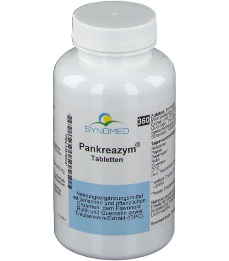 Nahrungsergänzungsmittel sind kein Ersatz für eine ausgewogene und abwechslungsreiche Ernährung und eine gesunde Lebensweise.Zutaten:Papain, Bromelain, Pankreatin, Füllstoff Mikrokristalline Cellulose, Rutin, Traubenkern-Extrakt (mit OPC), Maltodextrin, Quercetin, Überzugsmittel Schellack, Trennmittel Calciumsalze der Speisefettsäuren (pflanzlich), Füllstoff Siliciumdioxidglutenfrei.Nährwerte: Nährwerte pro Tablette Pankreatin 100 mg Bromelain 100 mg Papain 25 mg Rutin 100 mg Quercetin 10 mg OPC 30 mg Verzehrempfehlung:Täglich 2 x jeweils 1 Tablette mindestens eine halbe Stunde vor der Mahlzeit mit ausreichend Flüssigkeit verzehren.Hinweis:Die angegebene empfohlene tägliche Verzehrmenge darf nicht überschritten werden.Aufbewahrung:Kühl (6-25 °C) und lichtgeschützt lagern. Außerhalb der Reichweite von kleinen Kindern aufbewahren.Nettofüllmenge: 360 Tabletten = 156,6 gHerstellerdaten: Synomed GmbH Flamweg 132-13425335 Elmshorn ...