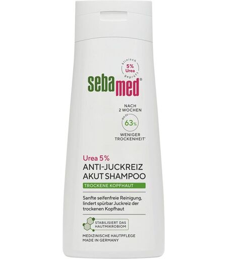 Anwendungsgebiet von Sebamed 5% Urea Anti-Juckreiz ShampooSebamed 5% Urea Anti-Juckreiz Shampoo:Lindert Juckreiz: Die ausgesuchten Inhaltsstoffe lindern spürbar Juckreiz bei sehr trockener Kopfhaut und helfen, die natürliche Feuchtigkeitsbalance von Haut und Haar wieder herzustellen. Hochkonzentrierter Harnstoff (Urea) spendet intensiv Feuchtigkeit trägt zur Glättung und Verbesserung der Symptome bei sehr trockener Kopfhaut bei.Wertvolle Inhaltsstoffe: Die milde Tensidkombination (Zuckertenside) reinigt schonend, sorgt für eine gesunde Haarstruktur und hilft, Austrocknung beim Haarewaschen zu vermeiden. Ein Stärkederivat trägt zu einer verbesserten Kämmbarkeit des Haares bei. Hochkonzentriertes Polidocanol hilft, Juckreiz nachhaltig zu lindern.Stabilisiert das Hautmikrobiom: Die Mikroorganismen der Haut leben in einem gut eingespielten ökologischen Gleichgewicht. Sebamed Produkte mit ihren schonenden Rezepturen, milden Inhaltsstoffen helfen, die Artenvielfalt und Vitalität dieses hauteigenen Ökosystems auf natürliche Weise zu erhalten und zu stabilisieren.Qualität Made in Germany: Unsere Produkte werden in Deutschland entwickelt, getestet und hergestellt. Die Qualität ist durch ausgewählte Rohstoffe und kontrollierte Fertigungsprozesse garantiert. Sebamed Produkte sind in über 400 Studien dermatologisch-klinisch getestet. 0 % Mikroplastik 0 % Silikone, veganDermatologisch-Klinisch bestätigt: Sebamed Produkte helfen, den natürlichen Hautschutzmantel zu stabilisieren und die Haut widerstandsfähiger gegen Umweltreize zu machen. Die Verträglichkeit und Pflegewirkung sind dermatologisch-klinisch geprüft und bestätigt. Dadurch trägt diese Pflegeserie nachweislich dazu bei, das Risiko für Hautreaktionen spürbar zu vermindern.Wirkstoffe / Inhaltsstoffe / ZutatenSebamed 5% Urea Anti-Juckreiz Shampoo enthält:Aqua, Urea, Disodium Laureth Sulfosuccinate, Sodium Lauryl Sulfoacetate, Laureth9, Lauryl Glucoside, S ...