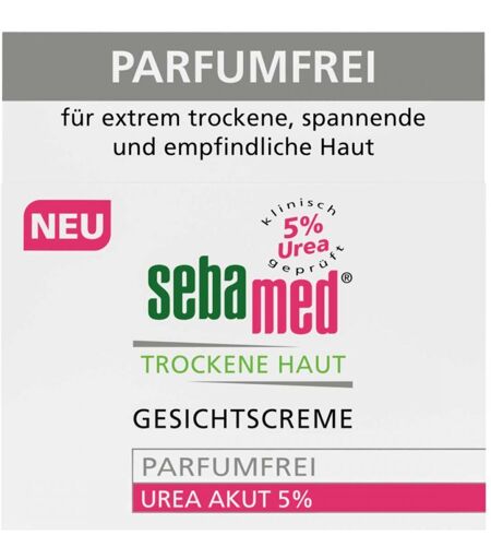 Anwendungsgebiet von Sebamed Trockene Haut Parfümfrei GesichtscremeSebamed Trockene Haut Parfümfrei Gesichtscreme lindert spürbar Spannungsgefühl, Schuppung und Rauheit bei sehr trockener Haut. Wirkstoffe / Inhaltsstoffe / ZutatenSebamed Trockene Haut Parfümfrei Gesichtscreme enthält: Aqua, Caprylic/Capric Triglyceride, Urea, Propylene Glycol, Tocopheryl Acetate, Glyceryl Stearate Citrate, Panthenol, Cetearyl Alcohol, Asiaticoside, Asiatic Acid, Madecassic Acid, Bisabolol, Citric Acid, Sodium Hydroxide, Sodium Carbomer, Phenoxyethanol, Sodium BenzoateGegenanzeigenSollte eine bekannte Überempfindlichkeit gegenüber einem der angegebenen Inhalts- oder Wirkstoffe bestehen, wird eine Anwendung dieses Produkts nicht empfohlen. Sebamed Trockene Haut Parfümfrei Gesichtscreme können in Ihrer Versandapotheke www.juvalis.de erworben werden. ...