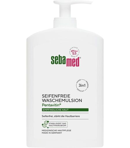 Anwendungsgebiet von Sebamed flüssig Waschemulsion mit SpenderSebamed flüssig Waschemulsion mit Spender ist eine seifenfreie Reinigung für empfindliche Haut. Sie stärkt die Hautbarriere und ist zur Hand-, Gesichts- und Körperreinigung geeignet.MILDE REINIGUNG: Ein Reinigungskomplex mit besonders milden Waschaktivsubstanzen reinigt die empfindliche Haut und hilft, die Haut vor Reizung und Austrocknung zu schützen. Ein Pflegekomplex mit Pentavitin und Panthenol gleicht Feuchtigkeitsverlust aus.HYGIENISCHER SPENDER: Ein Pump-Spender ermöglicht eine saubere und bequeme Möglichkeit, die sebamed Waschemulsion portionsgenau zu dosieren. Zur Hand-, Gesichts- und Körperreinigung geeignet.FÜR GESUNDE HAUT: Der pH-Wert 5,5 von sebamed stärkt die Funktion des natürlichen Hautschutzmantels auch gegen schädliche Umwelteinflüsse und trägt zur Gesunderhaltung der Haut bei.STABILISIERT DAS HAUTMIKROBIOM: Die Mikroorganismen der Haut leben in einem gut eingespielten ökologischen Gleichgewicht. Sebamed Produkte mit ihren schonenden Rezepturen, milden Inhaltsstoffen und dem pH-Wert 5,5 helfen, die Artenvielfalt und Vitalität dieses hauteigenen Ökosystems auf natürliche Weise zu erhalten und zu stabilisieren.QUALITÄT MADE IN GERMANY: Unsere Produkte werden in Deutschland entwickelt, getestet und hergestellt. Die Qualität ist durch ausgewählte Rohstoffe und kontrollierte Fertigungsprozesse garantiert. Sebamed Produkte sind in über 400 Studien dermatologisch-klinisch getestet.DERMATOLOGISCH-KLINISCH BESTÄTIGT: Sebamed Produkte helfen, den natürlichen Hautschutzmantel zu stabilisieren und die Haut widerstandsfähiger gegen Umweltreize zu machen. Die Verträglichkeit und Pflegewirkung sind dermatologischklinisch geprüft und bestätigt. Dadurch trägt diese Pflegeserie nachweislich dazu bei, das Risiko für Hautreaktionen spürbar zu vermindern.UNSER UMWELTVERSPRECHEN: 0 % Mikroplastik 0 % Silikone 0 % PEG, VEGANWirku ...
