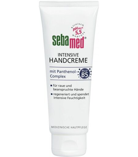 Anwendungsgebiet von Sebamed Intensive Handcreme Panthenol-complexSebamed Intensive Handcreme Panthenol-complex pflegt raue und beanspruchte Hände sofort und trägt zum Schutz vor Austrocknung bei.Wirkungsweise von Sebamed Intensive Handcreme Panthenol-complexEmpfindliche und problematische Haut braucht besondere Pflege. Nicht nur, dass sie Seife nicht verträgt, sondern ihr eigener, natürlicher Schutz gegen schädliche Umwelteinflüsse, Krankheitserreger und Austrocknung muss unterstützt werden. Ideal dafür sind die medizinischen Hautpflegeprodukte von sebamed mit dem pH-Wert 5,5. Sie fördern den hauteigenen Säureschutzmantel und machen die Haut dadurch widerstandsfähiger gegen die Belastungen, denen sie ständig ausgesetzt ist. Die Hautverträglichkeit und Pflegewirkung der sebamed Produkte ist dermatologisch und klinisch getestet. So bleibt die Haut gesund.Wirkstoffe / Inhaltsstoffe / ZutatenSebamed Intensive Handcreme Panthenol-complex enthält: Aqua, Ethylhexyl Stearate, Glycerin, Polyglyceryl-3 Dicitrate/Stearate, Persea gratissima oil, Butyrospermum parkii butter, Panthenol, Cetyl Alcohol, Glyceryl Behenate, Allantoin, Tocopheryl Acetate, Xanthan Gum, Citric Acid, Parfum, Phenoxyethanol, Sodium Benzoate GegenanzeigenBei bekannter Überempfindlichkeit gegenüber einem der oben genannten Inhaltsstoffe sollte dieses Produkt nicht angewendet werden. Sebamed Intensive Handcreme Panthenol-complex können in Ihrer Versandapotheke www.juvalis.de erworben werden. ...