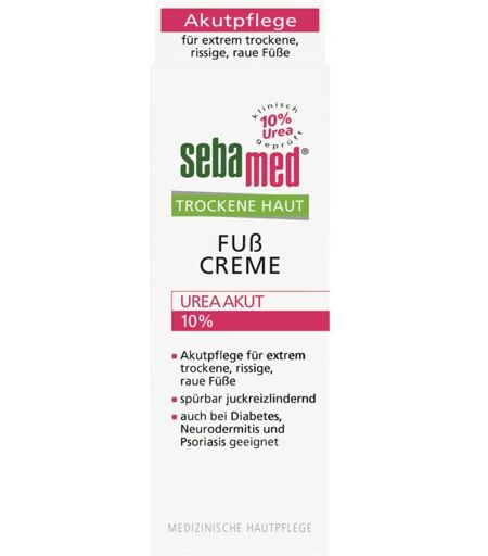 Anwendungsgebiet von Sebamed Trockene Haut 10% Urea Akut FußcremeSebamed Trockene Haut 10% Urea Akut Fußcreme ist eine komplexe Intensivpflege für sehr trockene, strapazierte und anspruchsvolle Haut. Diese Creme bietet der Füssen die Geschmeidigkeit und die Elastizität und lindert effektiv das Spannungsgefühl. Wirkungsweise von Sebamed Trockene Haut 10% Urea Akut FußcremeSebamed Trockene Haut 10% Urea Akut Fußcreme enthält hochkonzentrierten Harnstoff (Urea), der die Haut glättet und ihr viel Feuchtigkeit schenkt. Panthenol regeneriert intensiv die Haut. Vitamin E als ein Anti-Aging-Vitamin schützt vor schädlichen Umwelteinflüssen. Triglyceride auf pflanzlicher Basis binden Feuchtigkeit und sorgt für entsprechende Feuchtigkeitsbalance in der Haut.