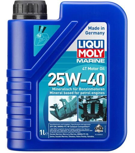 LIQUI MOLY Marine 4T Motor Oil 25W-40 [1L] Inhalt [Liter]:1 l Spezifikation:Honda Marine Spezifikation:Mercury Marine Spezifikation:Suzuki Marine Viskositätsklasse SAE:5W-40 Spezifikation:Yamaha Spezifikation:NMMA FC-W Catalyst C Spezifikation:Selva Spezifikation:API SM Spezifikation:Volvo Penta Spezifikation:NMMA FC-W Spezifikation:Tohatsu ...