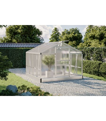 Artikelnummer: 80147 OUTFLEXX Flora Gewächshaus aus Aluminium, silver, mit Spitzdach – ideal für jede Gartensaison . Das OUTFLEXX Flora Gewächshaus bietet Ihnen die perfekte Möglichkeit, Ihren Garten in eine wahre Oase für Pflanzen zu verwandeln. Gefertigt aus hochwertigem Aluminium in elegantem Silver überzeugt dieses Gewächshaus nicht nur durch sein modernes Design, sondern auch durch seine Langlebigkeit und Witterungsbeständigkeit. Mit einer großzügigen Grundfläche von ca. 250 x 250 cm und einer Höhe von ca. 205 cm bietet es ausreichend Platz für all Ihre Gartenprojekte. Dieses Gewächshaus ist die ideale Lösung für Hobbygärtner und Profis, die ihre Pflanzen optimal schützen und fördern möchten. Dank des stabilen Spitzdachs wird Regenwasser zuverlässig abgeleitet, während die Konstruktion aus rostfreiem Aluminium und witterungsbeständigen Materialien für jahrelangen Einsatz sorgt. Der Innenraum bietet ein Volumen von ca. 6,25 m² und schafft somit ideale Bedingungen für Ihre Pflanzen, selbst bei schwierigen Wetterverhältnissen. Ein besonderes Highlight dieses Gewächshauses ist seine Korrosionsbeständigkeit. Die robuste Bauweise garantiert eine hohe Stabilität und Langlebigkeit. Gleichzeitig ist das Material wasserfest und frostbeständig, was das Gewächshaus zu einem treuen Begleiter für jede Gartensaison macht. Egal ob Frühling, Sommer, Herbst oder Winter – Ihre Pflanzen sind stets optimal geschützt. Das Gewächshaus zeichnet sich durch einen geringen Montageaufwand aus und wird mit einer detaillierten Aufbauanleitung geliefert. Somit ist es auch für Einsteiger problemlos aufbaubar. Das leichte Gewicht des Aluminiumrahmens ermöglicht zudem eine einfache Handhabung, ohne dabei an Stabilität einzubüßen. Mit ca. 250 x 250 cm Grundfläche eignet sich das Gewächshaus sowohl für kleinere als auch größere Gartenbereiche. Für eine optimale Nutzung sorgt das clevere Design mit einer großzügigen Türöffnung, die Ihnen ein komfortables Hineingehen und Arbeiten im Innenraum ermöglicht. Das elegante Silver-Finish fügt sich harmonisch in jede Gartenlandschaft ein und verleiht Ihrem Außenbereich eine stilvolle Note. Ob zur Anzucht von Pflanzen, zum Schutz vor Schädlingen oder einfach als wettergeschützter Ort für empfindliche Gewächse – dieses Gewächshaus erfüllt alle Anforderungen. Entscheiden Sie sich für das OUTFLEXX Flora Gewächshaus und profitieren Sie von einer hochwertigen Verarbeitung, einem durchdachten Design und einer Vielzahl an praktischen Eigenschaften. Bringen Sie Ihren Garten auf das nächste Level und schaffen Sie optimale Bedingungen für Ihre Pflanzen – das ganze Jahr über. Ihre Vorteile . - Robuste Konstruktion: Aluminiumrahmen Das langlebige Aluminium sorgt für Stabilität, Korrosionsbeständigkeit und eine lange Lebensdauer, selbst bei schwierigen Witterungsbedingungen. - Großzügiger Innenraum: 6,25 m² Mit ca. 250 x 250 cm Fläche und einem Volumen von ca. 6,25 m² bietet das Gewächshaus ausreichend Platz für die Anzucht und Pflege Ihrer Pflanzen.... ...