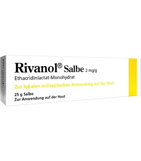 Anwendungsgebiet von Rivanol SalbeRivanol Salbe enthält den Wirkstoff Ethacridinlactat. Es ist ein Arzneimittel aus der Stoffgruppe der Acridinderivate mit einer breiten antibakteriellen Wirkung gegen Wundinfektionen (Antiseptikum). Es hemmt bei lokaler Anwendung den Aufbau der Bakterienwand und führt dadurch zum schnellen Absterben einer Vielzahl von Krankheitserregern. Es wird angewendet zur Keimminderung auf der Haut. Das Produkt eignet sich besonders für die Behandlung von kleinen Wunden und kann ideal unter Verbänden oder Pflastern angewendet werden.Wirkstoffe / Inhaltsstoffe / ZutatenRivanol Salbe enthält: Der Wirkstoff ist Ethacridinlactat-Monohydrat. 1 g Salbe enthält 2 mg Ethacridinlactat-Monohydrat. Die sonstigen Bestandteile sind Zinkoxid, Weizenstärke, Isopropylmyristat, weißes Vaselin, alpha-(Hexadecyl,octadecyl)-omega-hydroxypoly(oxyethylen)-3,5 und gereinigtes Wasser.GegenanzeigenBei bekannter Überempfindlichkeit gegenüber einen der oben genannten Inhaltstoffe sollte das Produkt nicht angewendet werden. Das Präparat darf nicht im Augenbereich angewendet werden. DosierungAnwendungsempfehlung von Rivanol Salbe: Tragen Sie die Salbe 3mal täglich in einer dünnen Schicht auf die erkrankte Hautstelle auf. Das Präparat dient zum Auftragen auf die Haut. Die Salbe sollte stets dünn aufgetragen werden, um den Eintrocknungsprozeß zu beschleunigen, Sekretstauungen zu vermeiden und um auf Verbandmaterial möglichst verzichten zu können.EinnahmeDas Präparat dient zum Auftragen auf die Haut. Die Salbe sollte stets dünn aufgetragen werden, um den Eintrocknungsprozeß zu beschleunigen, Sekretstauungen zu vermeiden und um auf Verbandmaterial möglichst verzichten zu können.PatientenhinweiseWarnhinweise und VorsichtsmaßnahmenBitte sprechen Sie mit Ihrem Arzt oder Apotheker, bevor Sie das Präparat anwenden. Besondere Vorsicht bei der Anwendung ist erforderlich:Hautstellen, auf die das Präparat aufgetragen ...