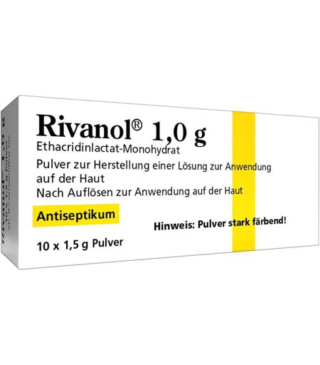Anwendungsgebiet von Rivanol 1,0gRivanol 1,0g ist ein sogenanntes Antiseptikum, das heißt es wirkt lokal auf Haut und Wunden gegen eine Vielzahl von krankmachenden Bakterien und Pilzen und wird z.B. gegen Wundinfektionen eingesetzt. Es hemmt bei lokaler Anwendung den Aufbau der Bakterienwand und führt dadurch zum schnellen Absterben der Krankheitserreger. Die aus dem Präparat hergestellte Lösung wird angewendet zur antiseptischen Spülung von Wunden und Körperhöhlen auch anzuwenden im Mund- und Rachenraum. Wirkstoffe / Inhaltsstoffe / ZutatenRivanol 1,0g enthält: Der Wirkstoff ist Ethacridinlactat-Monohydrat. 1 Beutel zu 1,5 g Pulver enthält 1,0 g Ethacridinlactat-Monohydrat. Der sonstige Bestandteil ist Harnstoff.GegenanzeigenBei bekannter Überempfindlichkeit gegenüber einen der oben genannten Inhaltsstoffe sollte das Produkt nicht angewendet werden. Die aus dem Präparat hergestellte Lösung darf nicht im Augenbereich angewendet werden.DosierungAnwendungsempfehlung von Rivanol 1,0g: Wenden Sie dieses Arzneimittel immer genau wie in dieser Packungsbeilage beschrieben bzw. genau nach der mit Ihrem Arzt oder Apotheker getroffenen Absprache an. Fragen Sie bei Ihrem Arzt oder Apotheker nach, wenn Sie sich nicht sicher sind. Die empfohlene Dosis beträgt: Zur Herstellung einer Lösung mit einer Konzentration von 0,1% wird der Inhalt von 1 Beutel Rivanol 1,0 g in 1 l warmem Wasser unter ständigem Umrühren aufgelöst, zur Herstellung einer 0,05%igen Lösung den Inhalt von 1 Beutel Rivanol 1,0 g in 2 l Wasser. Sollten Sie die Lösung erwärmt haben, ist sie vor der Anwendung wieder auf Raumtemperatur abzukühlen. Art der Anwendung: Die Lösung kann als Umschlag, Spülung oder z.B. in Form eines Handbades angewendet werden. Als allgemeine Dosierungsrichtlinie gilt: 2 x täglich die 0,1%ige Lösung lokal für mindestens 30 min einwirken lassen. Dauer der Anwendung: ...