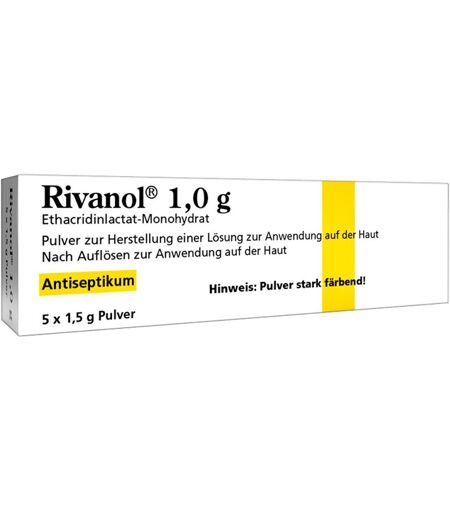 Anwendungsgebiet von Rivanol 1,0gRivanol 1,0g ist ein sogenanntes Antiseptikum, das heißt es wirkt lokal auf Haut und Wunden gegen eine Vielzahl von krankmachenden Bakterien und Pilzen und wird z.B. gegen Wundinfektionen eingesetzt. Es hemmt bei lokaler Anwendung den Aufbau der Bakterienwand und führt dadurch zum schnellen Absterben der Krankheitserreger. Die aus dem Präparat hergestellte Lösung wird angewendet zur antiseptischen Spülung von Wunden und Körperhöhlen auch anzuwenden im Mund- und Rachenraum. Wirkstoffe / Inhaltsstoffe / ZutatenRivanol 1,0g enthält: Der Wirkstoff ist Ethacridinlactat-Monohydrat. 1 Beutel zu 1,5 g Pulver enthält 1,0 g Ethacridinlactat-Monohydrat. Der sonstige Bestandteil ist Harnstoff.GegenanzeigenBei bekannter Überempfindlichkeit gegenüber einen der oben genannten Inhaltsstoffe sollte das Produkt nicht angewendet werden. Die aus dem Präparat hergestellte Lösung darf nicht im Augenbereich angewendet werden.DosierungAnwendungsempfehlung von Rivanol 1,0g: Wenden Sie dieses Arzneimittel immer genau wie in dieser Packungsbeilage beschrieben bzw. genau nach der mit Ihrem Arzt oder Apotheker getroffenen Absprache an. Fragen Sie bei Ihrem Arzt oder Apotheker nach, wenn Sie sich nicht sicher sind. Die empfohlene Dosis beträgt: Zur Herstellung einer Lösung mit einer Konzentration von 0,1% wird der Inhalt von 1 Beutel Rivanol 1,0 g in 1 l warmem Wasser unter ständigem Umrühren aufgelöst, zur Herstellung einer 0,05%igen Lösung den Inhalt von 1 Beutel Rivanol 1,0 g in 2 l Wasser. Sollten Sie die Lösung erwärmt haben, ist sie vor der Anwendung wieder auf Raumtemperatur abzukühlen. Art der Anwendung: Die Lösung kann als Umschlag, Spülung oder z.B. in Form eines Handbades angewendet werden. Als allgemeine Dosierungsrichtlinie gilt: 2 x täglich die 0,1%ige Lösung lokal für mindestens 30 min einwirken lassen. Dauer der Anwendung: ...
