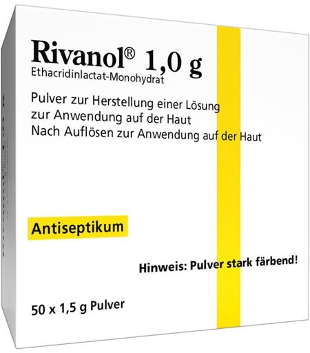 Anwendungsgebiet von Rivanol 1,0gDas Präparat ist ein sogenanntes Antiseptikum, das heißt es wirkt lokal auf Haut und Wunden gegen eine Vielzahl von krankmachenden Bakterien und Pilzen und wird z.B. gegen Wundinfektionen eingesetzt. Es hemmt bei lokaler Anwendung den Aufbau der Bakterienwand und führt dadurch zum schnellen Absterben der Krankheitserreger.Die aus dem Präparat hergestellte Lösung wird angewendet zur antiseptischen Spülung von Wunden und Körperhöhlen auch anzuwenden im Mund- und Rachenraum.Wirkstoffe / Inhaltsstoffe / Zutaten1 g Ethacridin lactat 1-Wasser0.7 g EthacridinHarnstoff Hilfstoff (+)GegenanzeigenDas Präparat darf nicht angewendet werden,wenn Sie allergisch gegen Ethacridinlactat, andere Acridinabkömmlinge oder den sonstigen Bestandteil dieses Arzneimittels sind.Die aus dem Präparat hergestellte Lösung darf nicht im Augenbereich angewendet werden.DosierungWenden Sie dieses Arzneimittel immer genau wie in dieser Packungsbeilage beschrieben bzw. genau nach der mit Ihrem Arzt oder Apotheker getroffenen Absprache an. Fragen Sie bei Ihrem Arzt oder Apotheker nach, wenn Sie sich nicht ganz sicher sind.Die empfohlene Dosis beträgt:Zur Herstellung einer Lösung mit einer Konzentration von 0,1% wird der Inhalt von 1 Beutel in 1 l warmem Wasser unter ständigem Umrühren aufgelöst, zur Herstellung einer 0,05%igen Lösung den Inhalt von 1 Beutel in 2 l Wasser. Sollten Sie die Lösung erwärmt haben, ist sie vor der Anwendung wieder auf Raumtemperatur abzukühlen. Dauer der AnwendungWenden Sie das Präparat ohne ärztlichen Rat nicht länger als 7 Tage an.Bitte sprechen Sie mit Ihrem Arzt oder Apotheker, wenn Sie den Eindruck haben, dass die Wirkung zu stark oder zu schwach ist. Wenn Sie eine größere Menge angewendet haben, als Sie sollten:Es sind bisher keine Vergiftungsfälle bei der Anwendung bekannt geworden. Wenn Sie die Anwendung vergessen haben:Die Anwendung sollte zum nächstmöglichen Zeitpunkt nachgeholt werden. Wenn Sie die ...