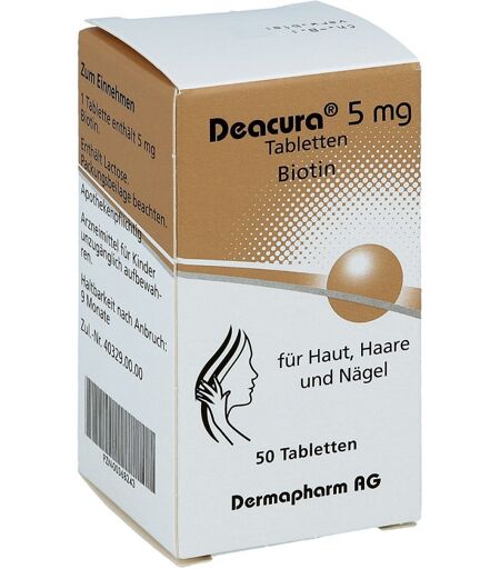 Anwendungsgebiet von Deacura 5 mg TablettenDas Arzneimittel ist ein Vitaminpräparat.Es wird angewendet zur Vorbeugung und Behandlung eines Biotin-Mangels. (Zur Vorbeugung sind weniger als 0,2 mg Biotin am Tag ausreichend.)Behandlung eines Biotin-Mangels beim sehr seltenen Biotin-abhängigen, multiplen Carboxylasemangel.Wirkstoffe / Inhaltsstoffe / Zutaten5 mg BiotinCellulose, mikrokristallin Hilfstoff (+)Crospovidon Hilfstoff (+)Lactose 1-Wasser Hilfstoff (+)Magnesium stearat Hilfstoff (+)Povidon K30 Hilfstoff (+)GegenanzeigenDas Arzneimittel darf nicht angewendet werdenwenn Sie allergisch gegen Biotin oder einen der sonstigen Bestandteile dieses Arzneimittels sind.DosierungNehmen Sie dieses Arzneimittel immer genau wie beschrieben bzw. genau nach der mit Ihrem Arzt oder Apotheker getroffenen Absprache ein. Fragen Sie bei Ihrem Arzt oder Apotheker nach, wenn Sie sich nicht sicher sind.Die empfohlene Dosis beträgt:Täglich 1/2 - 1 Tablette (entsprechend 2,5 - 5 mg Biotin). Zur Vorbeugung von Mangelzuständen sind weniger als 0,2 mg Biotin pro Tag ausreichend.Zur Therapie des multiplen Carboxylasemangels: Täglich 1 - 2 Tablette(n) (entsprechend 5 - 10 mg Biotin).Für niedrigere Dosierungen stehen Präparate mit geringerem Gehalt an Biotin zur Verfügung. Dauer der AnwendungDas Präparat wird bis zur Normalisierung der Biotin-Werte eingenommen. Die Dauer der Einnahme ist abhängig vom Verlauf der Grunderkrankung. Befragen Sie hierzu bitte Ihren Arzt.Beim sehr seltenen Biotin-abhängigen, multiplen Carboxylasemangel erfolgt die Einnahme lebenslang.Bitte sprechen Sie mit Ihrem Arzt oder Apotheker, wenn Sie den Eindruck haben, dass die Wirkung zu stark oder zu schwach ist. Wenn Sie eine größere Menge eingenommen haben, als Sie sollten Sie können die Behandlung mit der angegebenen Dosierung fortsetzen. Bei einer kurzfristigen Überdosierung sind keine unerwünschten Wirkungen zu erwarten. Wenn Sie die Anwendung vergessen habenWenden Sie nicht die doppelte Dosis an ...