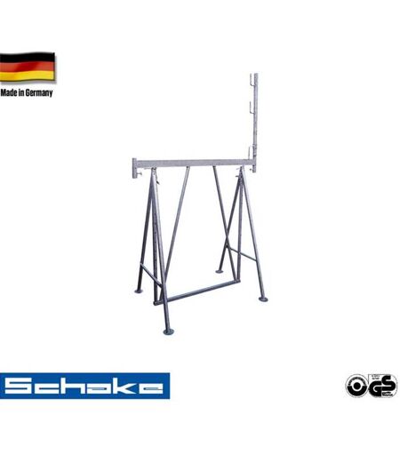Artikel Faltgerüstbock „Universal U 1500“ Hersteller Das deutsche Unternehmen Schake wurde 1908 von Johann Schake in Wetter Volmarstein gegründet. Im Laufe der Jahre spezialisierte sich die Firma auf die Produktion von Baugeräte und Absperrtechnik. Nach wie vor werden viele ihrer Produkte in Deutschland und Europa hergestellt um eine exzellente und gleichbleibende Qualität sicherzustellen. Anwendung Gerüstböcke sind häufig verwendete Artikel rund um den Bau. Mit Ihnen lassen sich erhöhte Arbeitsplattformen in beliebiger Länge bauen, was insbesondere bei Mauer- und Putzarbeiten im Innenbereich zum Tragen kommt. Faltgerüstböcke können besonders platzsparend gelagert und transportiert werden, da sich die Stirnteile mit den Aufstellfüßen parallel zu den Querträgern eindrehen lassen. Material, Eigenschaften und Ausstattung · Stabile Stahlkonstruktion, mit robuster Lackierung oder wetterfest verzinkt · Auflagetraverse aus 40 mm x 40 mm Vierkantrohr · Seitlich angeschweißte Rohraufnahme für Geländerpfosten und Anti-Absturz Blech · Beide Standfüße (aus Ø 42 mm Rundrohr) nach innen eindrehbar, sodass sie platzsparend anliegen · Große Fußplatten für ausgeglichene Gewichtsverteilung und geringe Punktlasten · Tragkraft: 900 kg · Breite der Auflagefläche 150 cm · Höhe der Auflagefläche 1,70 – 3,00 m · 2 angeschweißte Kippstifte zur Aufnahme von Diagonalen · In feiner Rasterung höhenverstellbar über das gelochte Innenrohr, Sicherung durch unverlierbaren Haken · Made in Germany Zusatzinformationen und Hinweise · Neben der lackierten Variante ist auch eine hochwertige verzinkte Variante erhältlich · Bitte beachten Sie die Aufbau- und Verwendungsanleitung · Gerade breite Gerüstböcke erlauben es neben dem Laufweg auch Arbeitsmaterialien zu lagern ...