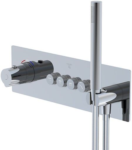 Unterputz-Thermostat ¾″ mit pushtronic Bedienkomfort, mit Mengenregulierung, mit Styropor-Einbaukasten, mit integriertem Schlauchanschluss und Brausehalter sowie einer Metall-Stabhandbrause und Brauseschlauch, 4 Buttons mit unterschiedlichen Symbolen im Lieferumfang enthalten, mit Thermostatkartusche, mit Abdeckplatte 120 mm x 396 mm, chrom Highlight: PUSHTRONIC MIT MENGENREGULIERUNG Von der angenehm weichen Regenbrause zum kräftigen, massierenden Wasserstrahl: Duschliebhaber schätzen das individuelle Wellness-Erlebnis in ihrem Bad. Das Unterputz-Thermostat mit Pushtronic-Bedienkomfort verfügt über eine einfach zu bedienende Mengenregulierung: Durch Drehen des jeweiligen Buttons wird die gewünschte Strahl-Intensität eingestellt. Details: Bitte beachten Sie, dass diese Badarmatur aufgrund des hohen Wasserdurchflusses leider nicht für Durchlauferhitzer geeignet ist. Dieses Produkt besteht aus massivem Messing. Abgerundet mit einer hochwertigen und langlebigen Chrom-Oberfläche für wunderschöne Lichtreflexe. Armatur mit Thermostat für eine Temperaturvoreinstellung und eine angenehme Regulierung der Temperatur. Mit einer integrierten Verbrühschutz-Sicherheitssperre bei 38°C. Zur Unterputzmontage - Technische Komponenten und Anschlüsse sind für ein stylisches Ambiente in der Wand versteckt. Dank des schlichten eckigen Designs fügt sich das Produkt in jedes Badambiente ein. Diese Armatur ermöglicht die Regulierung der Wassermenge. Mit dieser Armatur können Sie bis zu vier Verbraucher ansteuern (z.B. Handbrause, Kopfbrause, Wanneneinlauf). Möchten Sie weniger Verbraucher ansteuern (z.B. nur Handbrause und Kopfbrause) benötigen Sie eine Armatur mit weniger Umstellungsmöglichkeiten Technische Details: Durchlauferhitzer: Nicht für Durchlauferhitzer geeignet Material: Messing Farbauswahl: Chrom Armaturenart: Thermostat-Armatur Montageart: Unterputzmontage Design: Eckiges Design Mengenregulierung: Mit Mengenregulierung Umstellungsvarianten: Mit 4 Ausgängen weitere Details: UP-Thermostat ¾“ mit pushtronic mit Mengenregulierung für 4 Verbraucher mit Unterputz-Einbaurkörper chrom ...