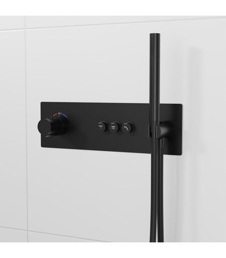 Unterputz-Thermostat ¾″ mit pushtronic Bedienkomfort,mit Mengenregulierung, mit Styropor-Einbaukasten, mit integriertem Schlauchanschluss und Brausehalter sowie einer Metall-Stabhandbrause und Brauseschlauch, 4 Buttons mit unterschiedlichen Symbolen im Lieferumfang enthalten, mit Thermostatkartusche, mit Abdeckplatte 120 mm x 396 mm, matt black Highlight: PUSHTRONIC MIT MENGENREGULIERUNG Von der angenehm weichen Regenbrause zum kräftigen, massierenden Wasserstrahl: Duschliebhaber schätzen das individuelle Wellness-Erlebnis in ihrem Bad. Das Unterputz-Thermostat mit Pushtronic-Bedienkomfort verfügt über eine einfach zu bedienende Mengenregulierung: Durch Drehen des jeweiligen Buttons wird die gewünschte Strahl-Intensität eingestellt. Details: Bitte beachten Sie, dass diese Badarmatur aufgrund des hohen Wasserdurchflusses leider nicht für Durchlauferhitzer geeignet ist. Dieses Produkt besteht aus massivem Messing. Steinberg-Produkt in tiefem Mattschwarz. Durch ein aufwendiges Verfahren wird eine makellos glatte, aber dennoch matte Oberfläche erreicht. Das Ergebnis ist eine maximal korrosionsbeständige, tiefschwarze Oberfläche mit sanften und ruhigen Lichtreflexen. Armatur mit Thermostat für eine Temperaturvoreinstellung und eine angenehme Regulierung der Temperatur. Mit einer integrierten Verbrühschutz-Sicherheitssperre bei 38°C. Zur Unterputzmontage - Technische Komponenten und Anschlüsse sind für ein stylisches Ambiente in der Wand versteckt. Dank des schlichten eckigen Designs fügt sich das Produkt in jedes Badambiente ein. Diese Armatur ermöglicht die Regulierung der Wassermenge. Mit dieser Armatur können Sie bis zu drei Verbraucher ansteuern (z.B. Handbrause, Regenbrause, Wanneneinlauf). Möchten Sie weitere Verbraucher ansteuern benötigen Sie eine Armatur mit mehr Umstellungsmöglichkeiten (z.B. Armatur mit 4-Wege-Umsteller). Technische Details: Durchlauferhitzer: Nicht für Durchlauferhitzer geeignet Material: Messing Farbauswahl: Schwarz matt Armaturenart: Thermostat-Armatur Montageart: Unterputzmontage Design: Eckiges Design Mengenregulierung: Mit Mengenregulierung Umstellungsvarianten: Mit 3 Ausgängen weitere Details: UP-Thermostat ¾“ mit pushtronic für 3 Verbraucher,mit Mengenregulierung mit Unterputz-Einbaukörper matt black ...