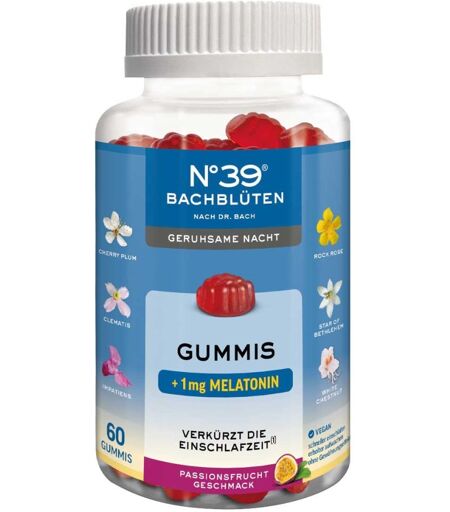 Anwendungsgebiet von Bachblüten Nummer 3 9 Emergency+gummies NachtBachblüten Nummer 3 9 Emergency+gummies Nacht sind pflanzliche Weichgummis, die helfen abends Ruhe zu finden und um schneller und angenehmer einzuschlafen. Für ein erholtes Aufwachen am Morgen. Die weichen Gummis haben einen natürlichen Passionsfruchtgeschmack und sind frei von Gluten, Laktose, Weichmachern, Gelatine und Konservierungsstoffen. Bachblüten Nummer 3 9 Emergency+gummies Nacht wird nicht mit Schweinegelatine hergestellt, sondern mit Pektin, einem rein pflanzlichen Rohstoff, dem zahlreiche positive Eigenschaften für die Gesundheit zugeschrieben werden. Daher ist das Produkt zu 100 % vegan. Ein Gummi enthält 1 mg Melatonin sowie das Stoffwechselvitamin B6 und Passionsblumenkrautextrakt, ein 3-Komponenten-Präparat für einen erholsamen Schlaf. Bachblüten Nummer 3 9 Emergency+gummies Nacht enthalten die original N°39® - Mischung von Edward Bach aus folgenden Blüten: - Cherry Plum - Blüte der Gelöstheit - Clematis - Blüte der wachen Gedanken - Impatiens - Blüte der inneren Ruhe - Rock Rose - Blüte der inneren Stärke - Star of Betlehem - Blüte des inneren Friedens - White Chestnut - Blüte der Gedankenstille Wirkungsweise von Bachblüten Nummer 3 9 Emergency+gummies NachtDas Schlafhormon Melatonin trägt zur Verkürzung der Einschlafzeit bei und sorgt für ausreichenden und erholsamen Schlaf. Dies ist äußerst wichtig für die körperliche und geistige Regeneration. Der Schlafrhythmus kann durch die Einnahme von Melatonin koordiniert werden. Melatonin wird im Körper nach etwa 6 Stunden abgebaut. Vitamin B6, das zu einer normalen Funktion des Nervensystems beiträgt, wirkt additiv auf den aktiven Melatonin-Komplex und bildet in Kombination mit Passionsblumenextrakt ein effektives Energiepaket.Wirkstoffe / Inhaltsstoffe / ZutatenInhaltsstoffe von Bachblüten Nummer 3 9 Emergency+gummies Nacht: ...