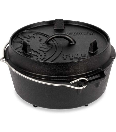 Petromax Feuertopf Dutch oven ft4.5 Produktnummer: 0691404108 Der originale Petromax Feuertopf ft4.5, oft auch als Dutch Oven bezeichnet, eignet sich ideal für das Kochen und Backen im Freien oder im heimischen Backofen. Gusseiserne Töpfe existieren seit dem 18. Jahrhundert. Durch die hervorragenden Eigenschaften des Gusseisens und die spezielle Oberflächenstruktur wird die Wärme effizient gespeichert und weitergeleitet. Die vorbehandelte Oberfläche (seasoned finish) macht ein erstmaliges Einbrennen unnötig und der robuste Feuertopf kann sofort verwendet werden. Im Freien wird er auf dem offenen Feuer oder mit Holzkohle verwendet. Der erhöhte Rand des Deckels ermöglicht es, Glut oder Holzkohle auch auf dem Feuertopf zu platzieren. So wird der Feuertopf von allen Seiten beheizt und eignet sich beispielsweise auch zum Brot backen. Ein robuster Henkel ermöglicht das sichere Heben des Feuertopfes, drei Füße geben dem Feuertopf einen sicheren Stand und eine Thermometerdurchführung ermöglicht es, die Temperatur zu überprüfen ohne den Deckel anheben zu müssen. In der mittelgroßen Ausführung ft4.5 mit Standfüßen hat der Feuertopf ein Fassungsvermögen von ca. 3,5 Litern. Damit können Gerichte für 2 bis 5 Personen zubereitet werden. Farbe: schwarz Maße: H x B x T (außen): 15,4 x 29,1 x 17 cm H x B x T (innen): 5 x 28 x 10 cm Material: Gusseisen Inhalt (gesamt): 3,5 l vorbehandelte Oberfläche (seasoned finish) variabel verwendbar, z.B. über Holzkohle, offenem Feuer, zu Hause im Backofen robuster Henkel, drei Füße und Thermometerdurchführung vorhanden Gewicht: 4,5 kg Herstellerinformationen: Petromax GmbH Sudenburger Wuhne 61 39116 Magdeburg, Deutschland eMail: info@petromax.de Herstellernr. FT4.5 ...